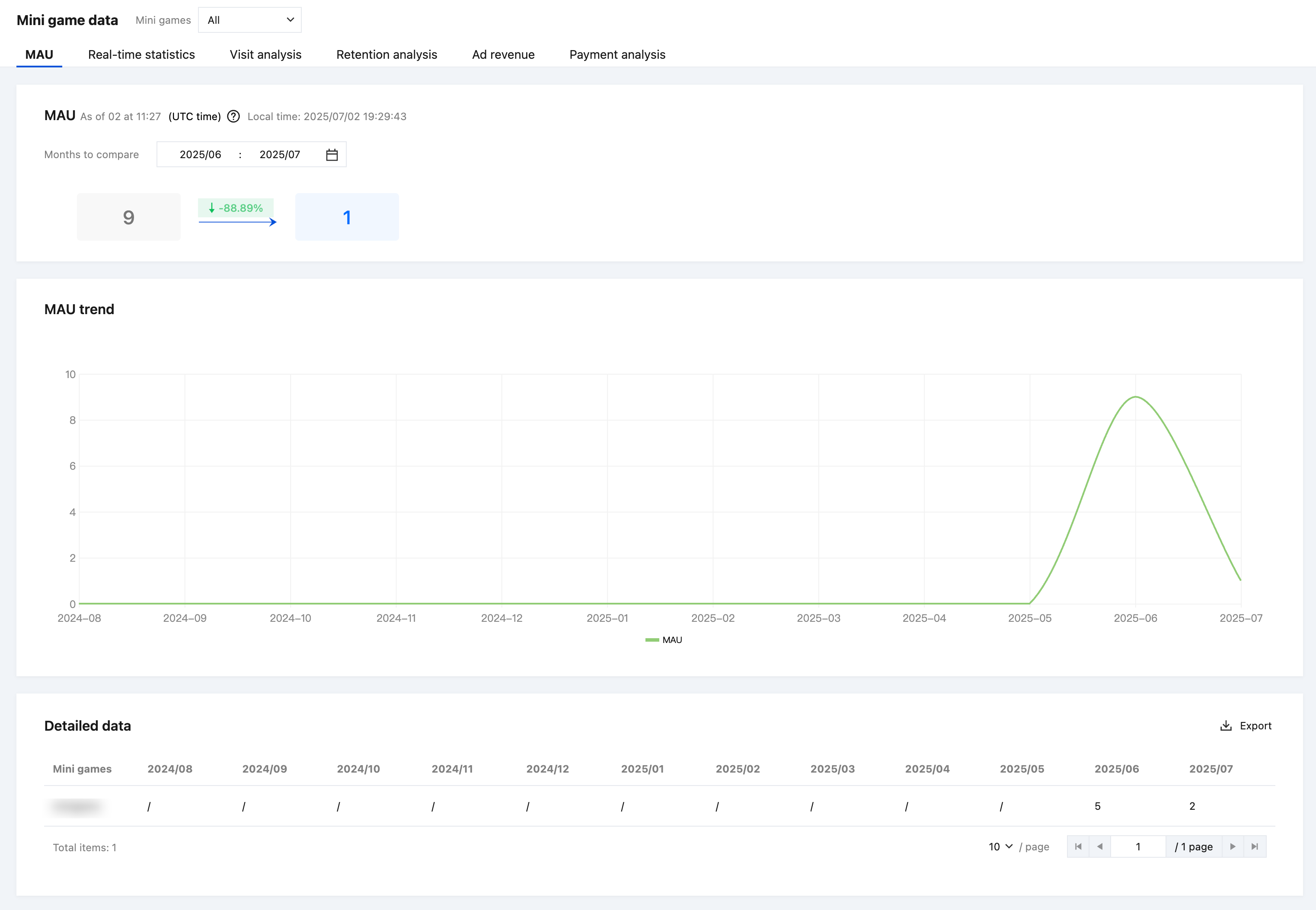 提供最近 12 个月内的 MAU 数据,可选择 2 个月份进行数据对比,支持导出详细数据。