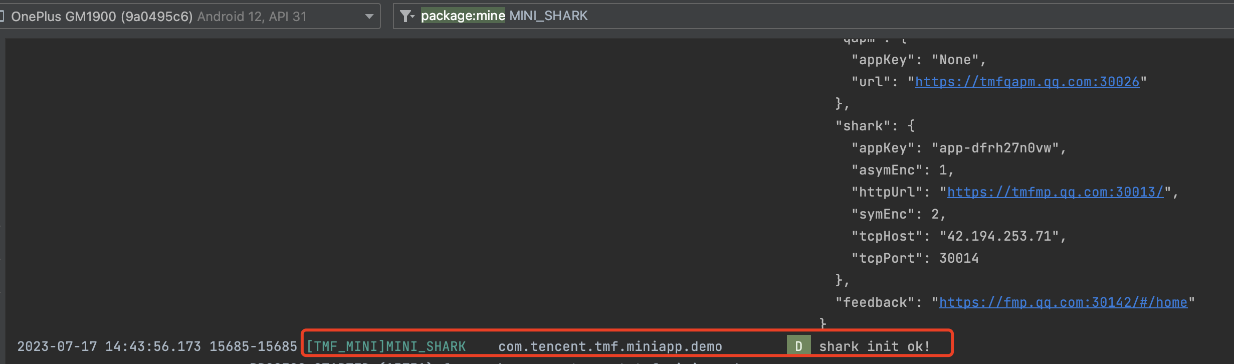 从小程序 SDK mini_core 的 1.5.1.1版本之后,可通过 MINI_SHARK 过滤日志,确定初始化是否成功,初始化成功会输出:‘shark init ok!’,如图: