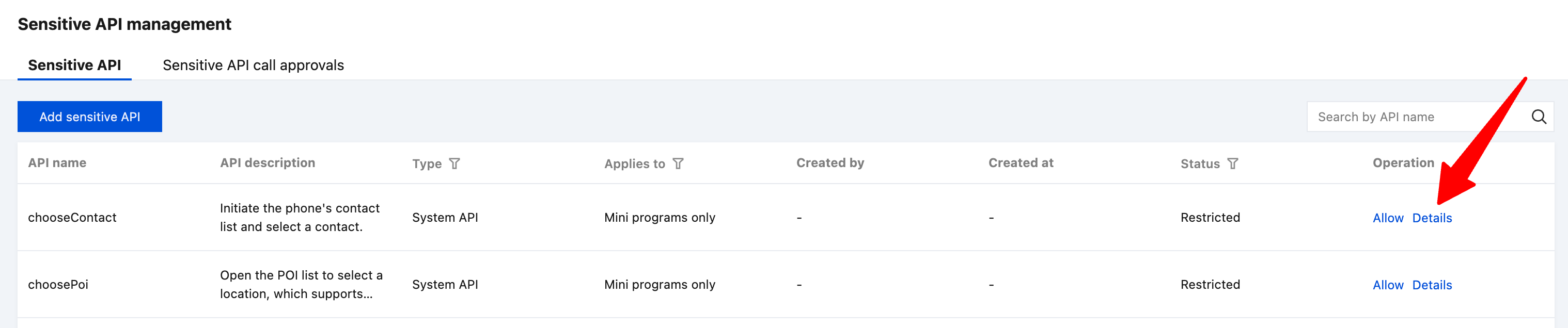 在敏感 API 列表后点击“详情”按钮,进入敏感 API 详情页面。