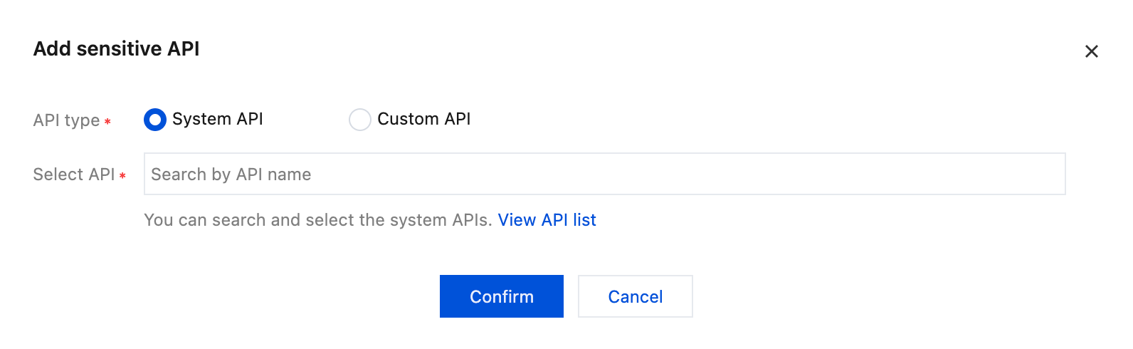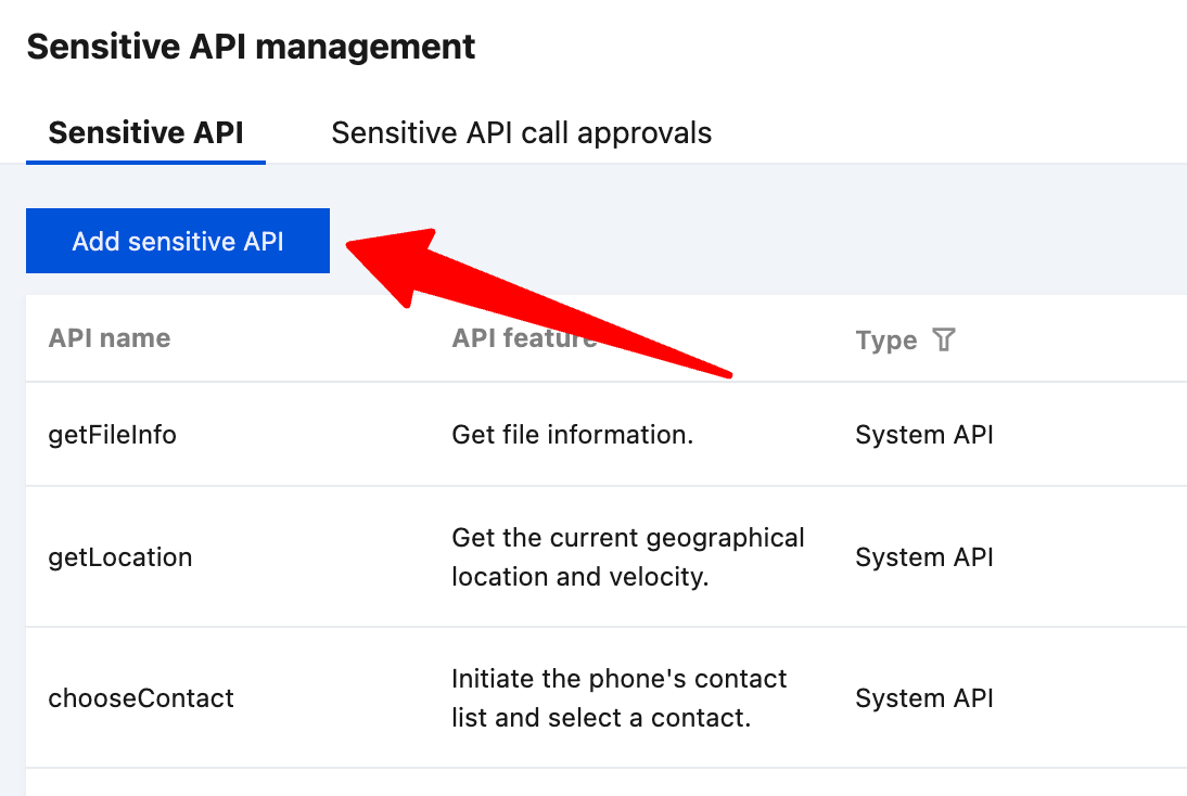 如果您觉得现有的敏感 API 列表不满足 superapp 的安全需求,您可以单击添加敏感 API,从系统 API 列表中搜索并选择更多的 API 添加到敏感 API 列表中。