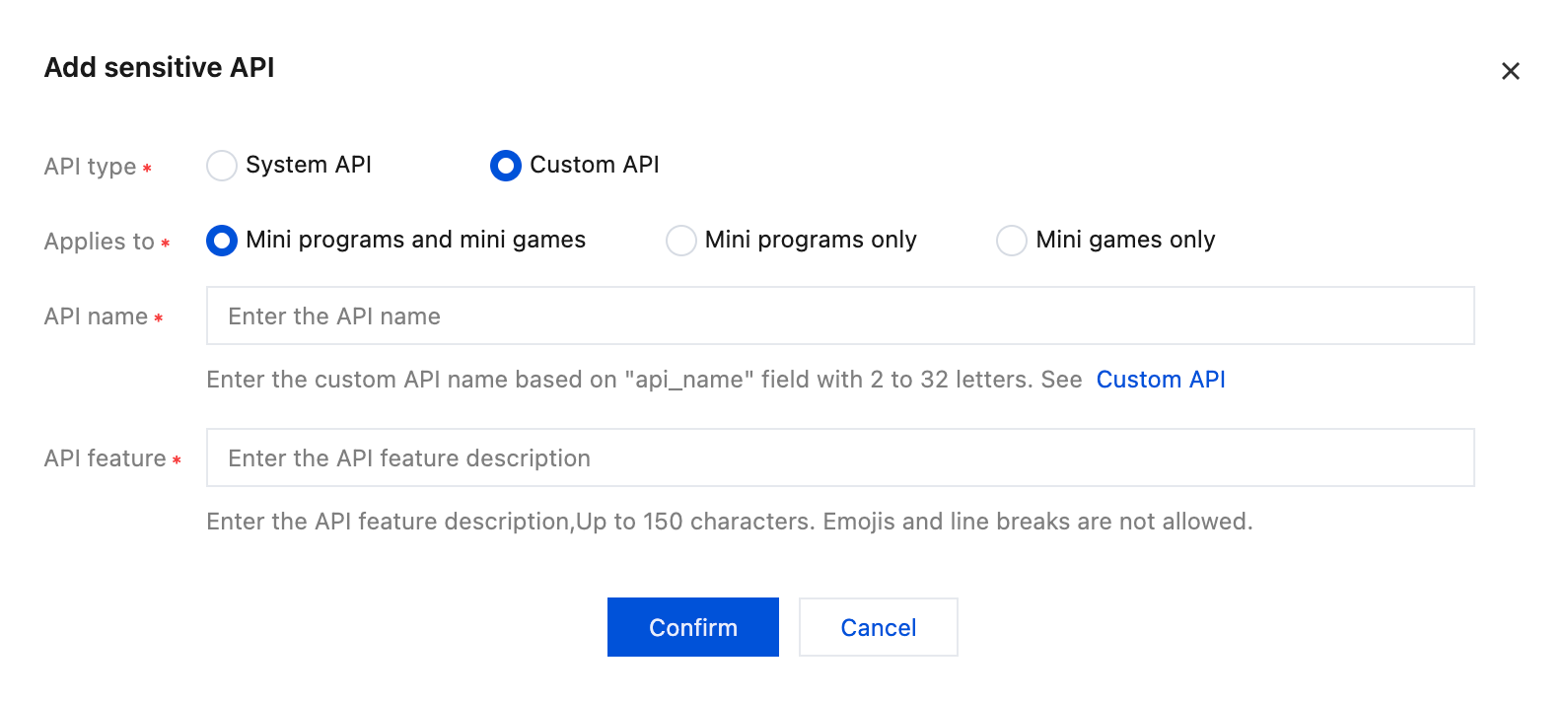 如果您的 superapp 中用到了自定义 API,您也可以将自定义 API 也添加为敏感 API。 填写自定义 API 名称和 API 功能,设置自定义敏感 API 的适用范围,可设置为小程序和小游戏通用,或仅适用于小程序、仅适用于小游戏。