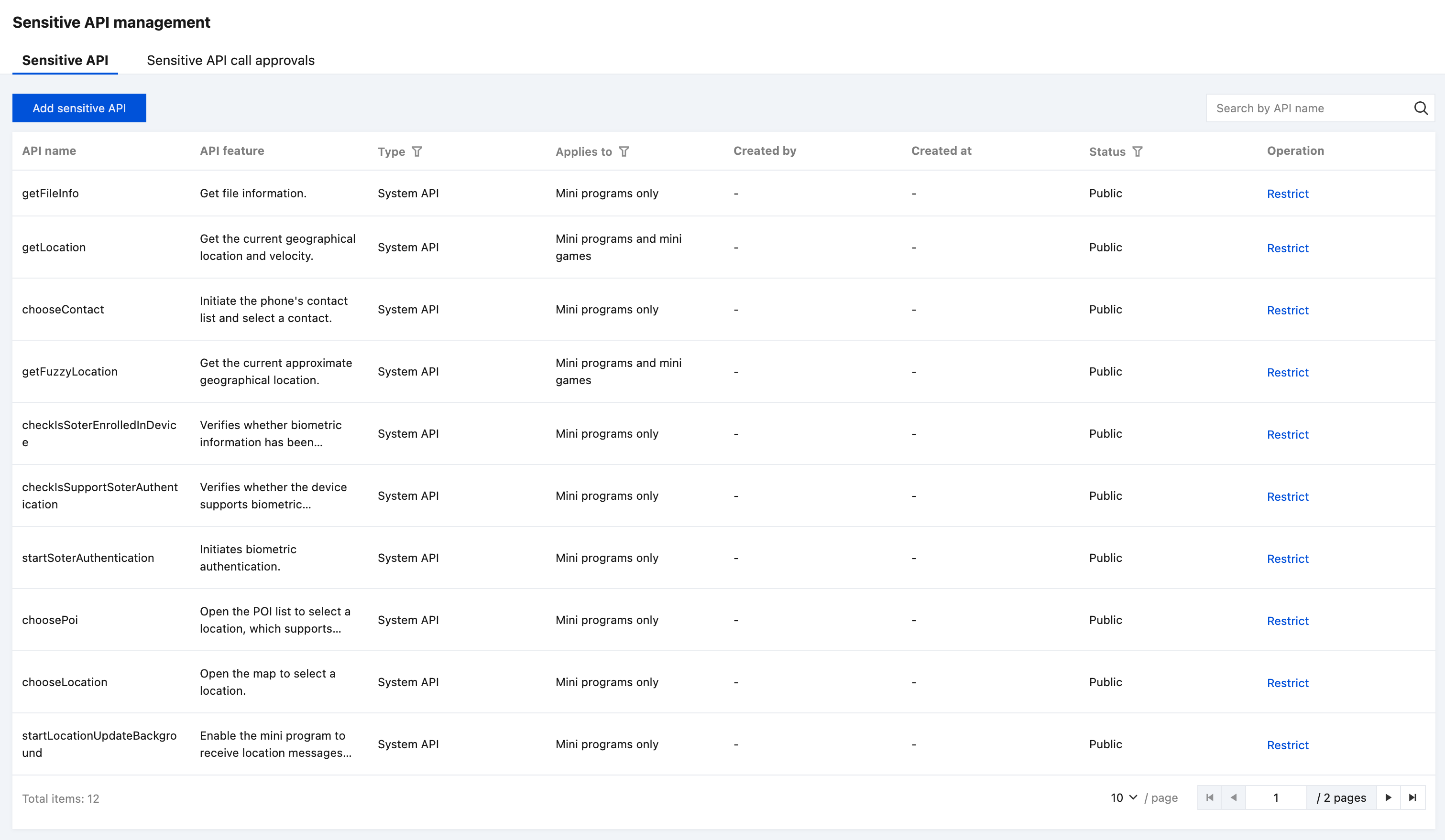 公开:处于公开状态下的 API,无需向 superapp 申请调用权限,可直接使用,单击“限制”操作,可将 API 状态变更为“受限”。