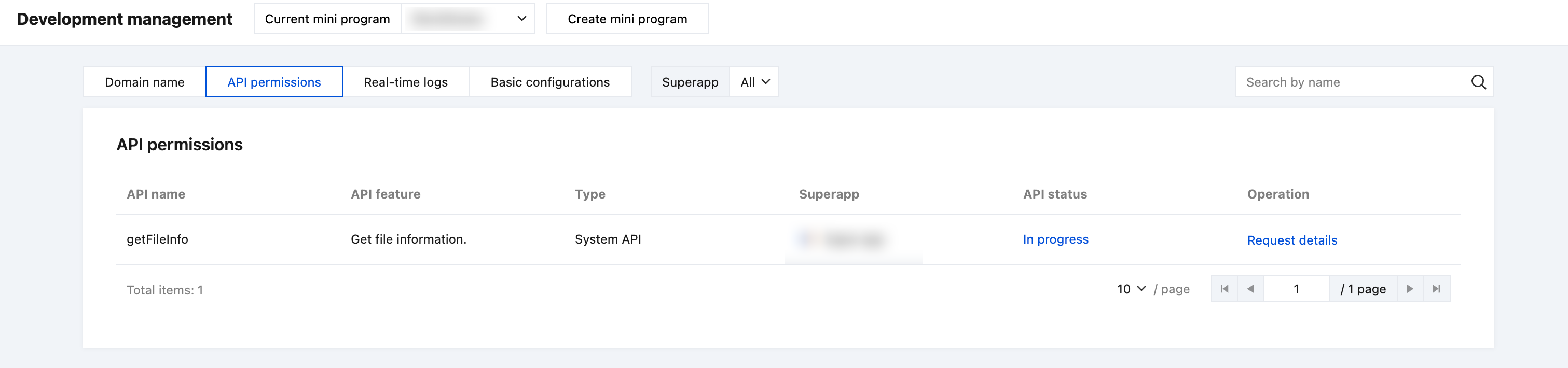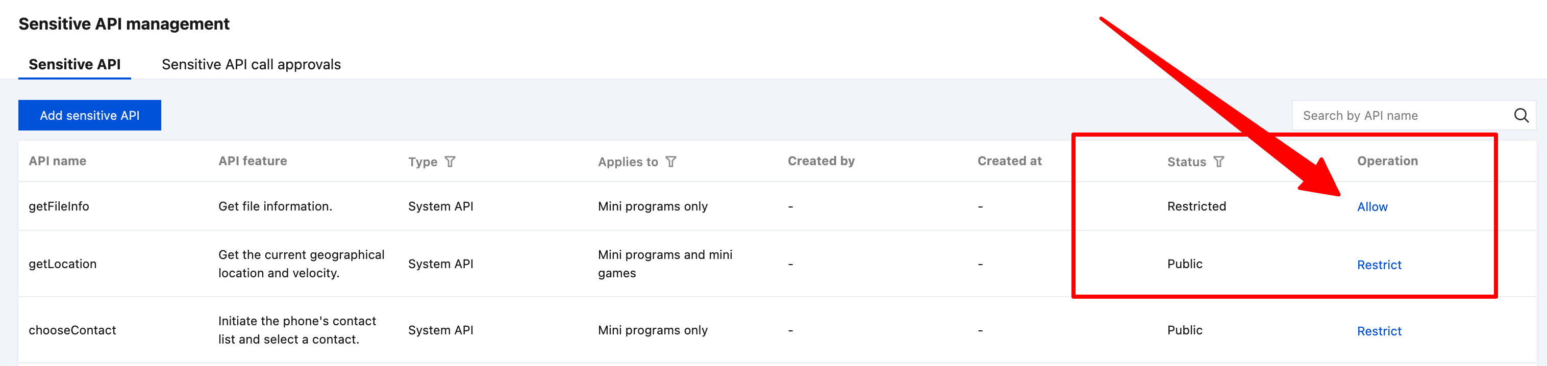小程序或小游戏的开发者需要在小程序团队内,左侧菜单“小程序管理/小游戏管理 > 开发管理”处,单击“接口权限”,查看当前小程序或小游戏绑定的 superapp 设置的敏感 API。