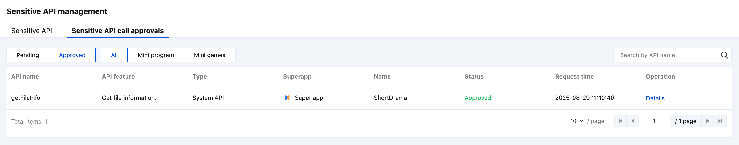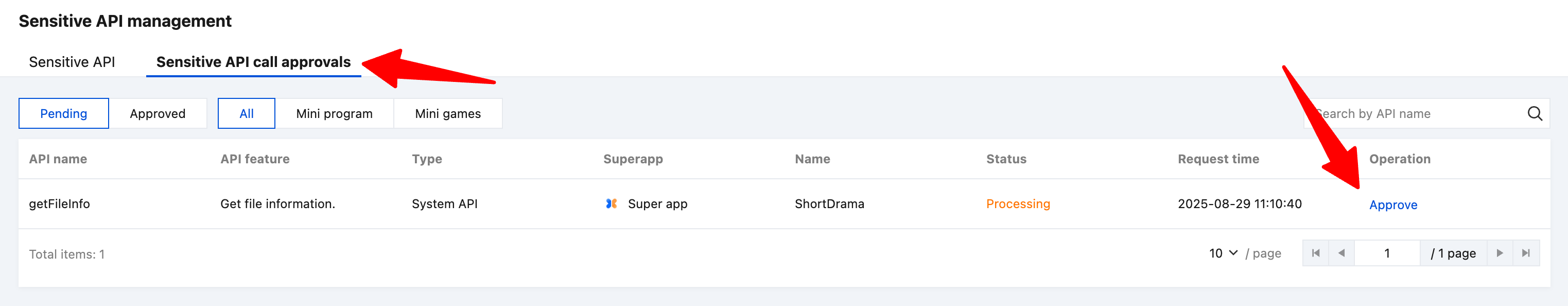 小程序或小游戏开发者申请敏感 API 调用权限后,superapp 团队管理员和审核人员,在“应用管理-敏感 API 管理-敏感 API 调用审批”下,会收到审批信息。