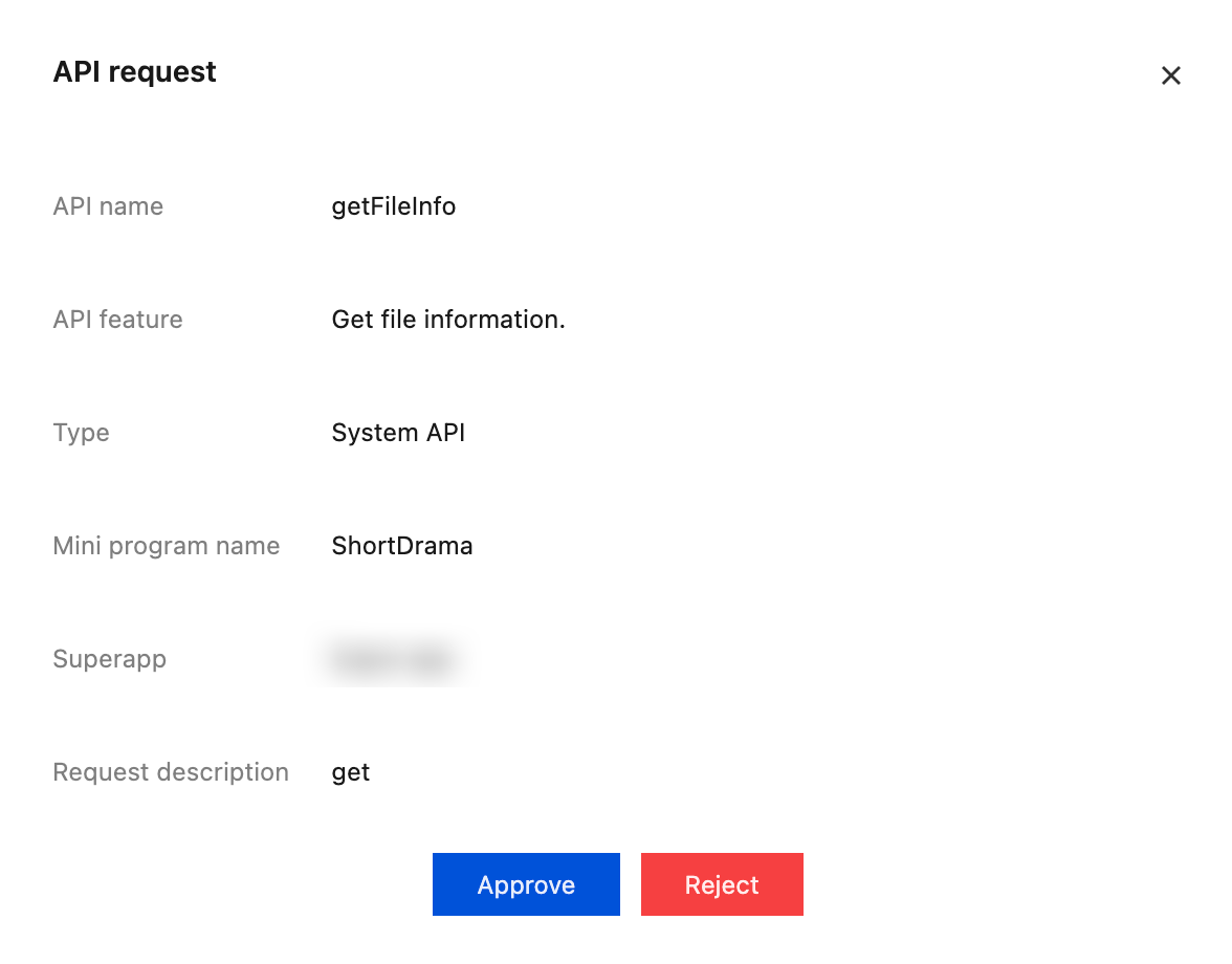 单击审批,弹出审批信息窗口,单击通过,则代表同意小程序或小游戏调用该敏感 API,单击驳回,则小程序无法调用该敏感 API。