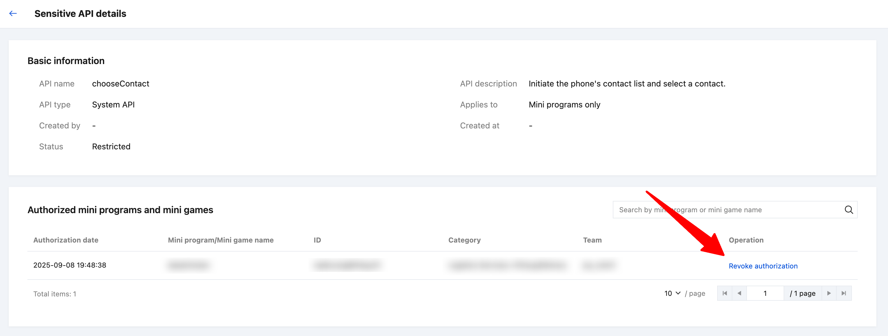 在下方已获授权的小程序或小游戏列表处可以查看目前已经使用了该敏感 API 的小程序或小游戏列表,点击“取消授权”,可以将该权限收回,取消授权后,小程序或小游戏需要重新申请该敏感 API 的调用权限。