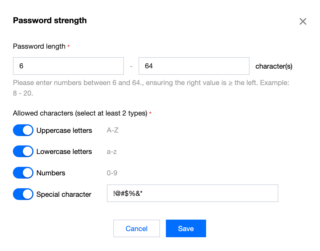 必须从以下 4 种字符类型中至少选择 2 种,密码强度字符类型说明: