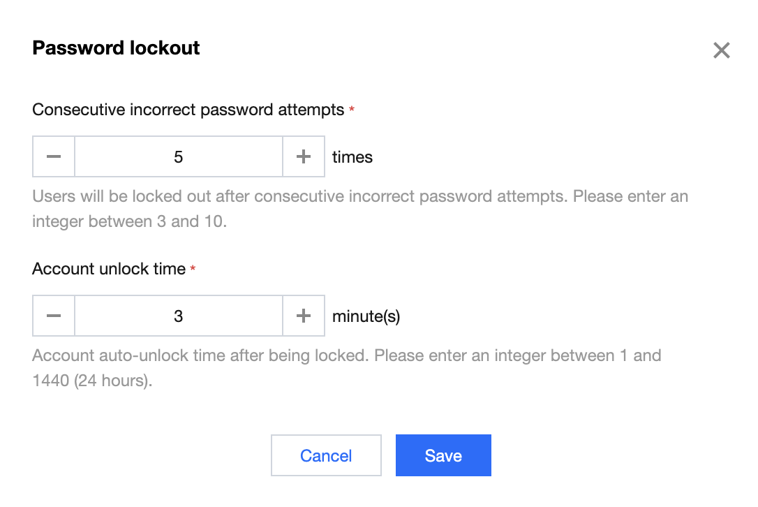 账号锁定后,自动解锁的时间。请填写 1-1440(24 小时) 内的整数。单位:分钟。