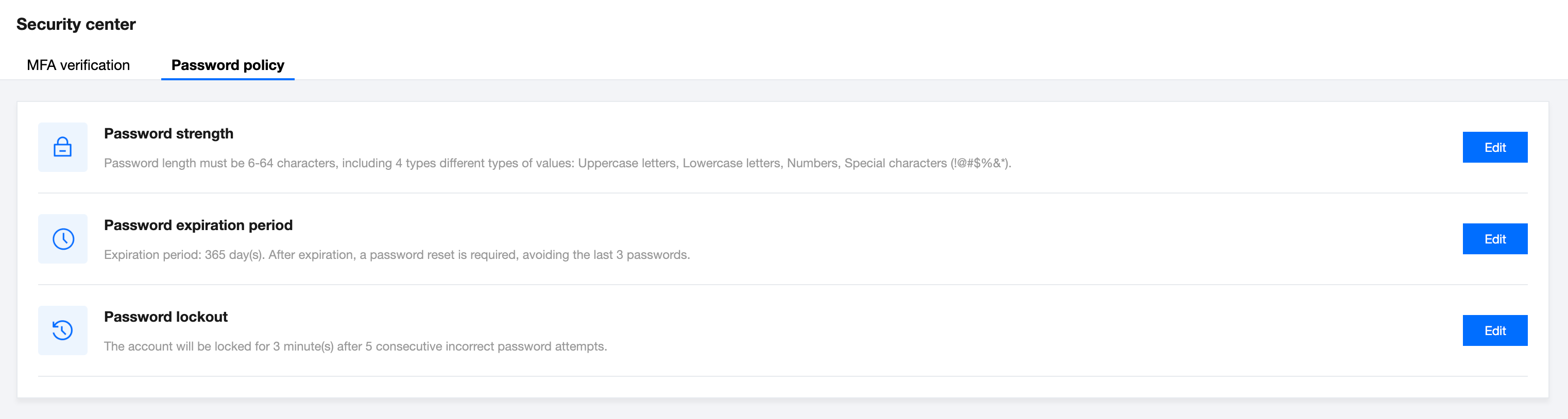 为提升系统的安全性,超管及平台管理员可以在【平台管理-安全中心-密码管理】中配置对 TCMPP 全部成员生效的密码规则,包括密码强度、密码有效期、密码锁定。