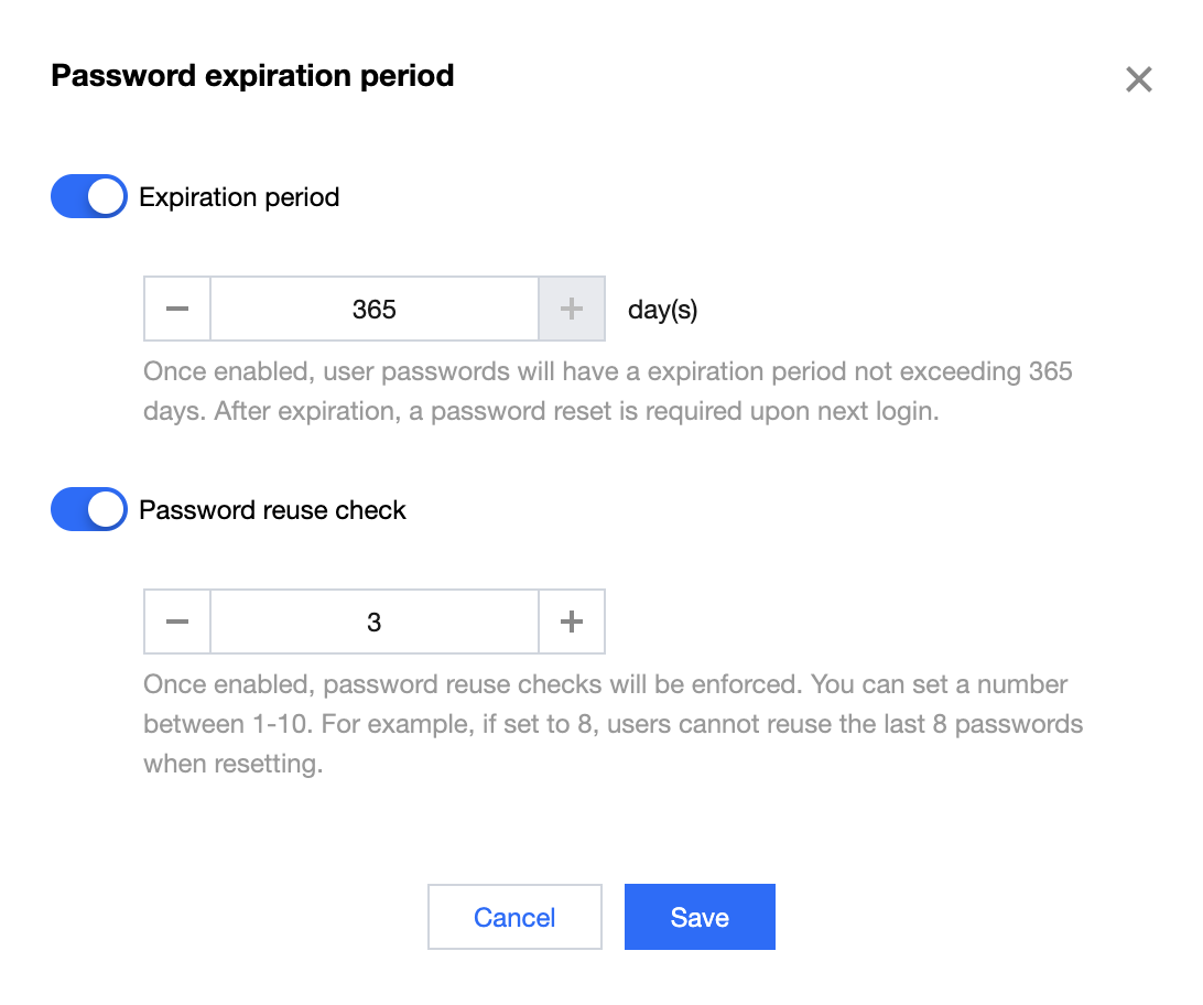 密码有效期是每个用户两次修改密码间隔的上限,将在用户完成一次修改密码后更新以有效期限更新密码到期时间。开启密码有效期后,用户需在密码有效期到期前修改密码。可对密码有效期进行两个方面的自定义: