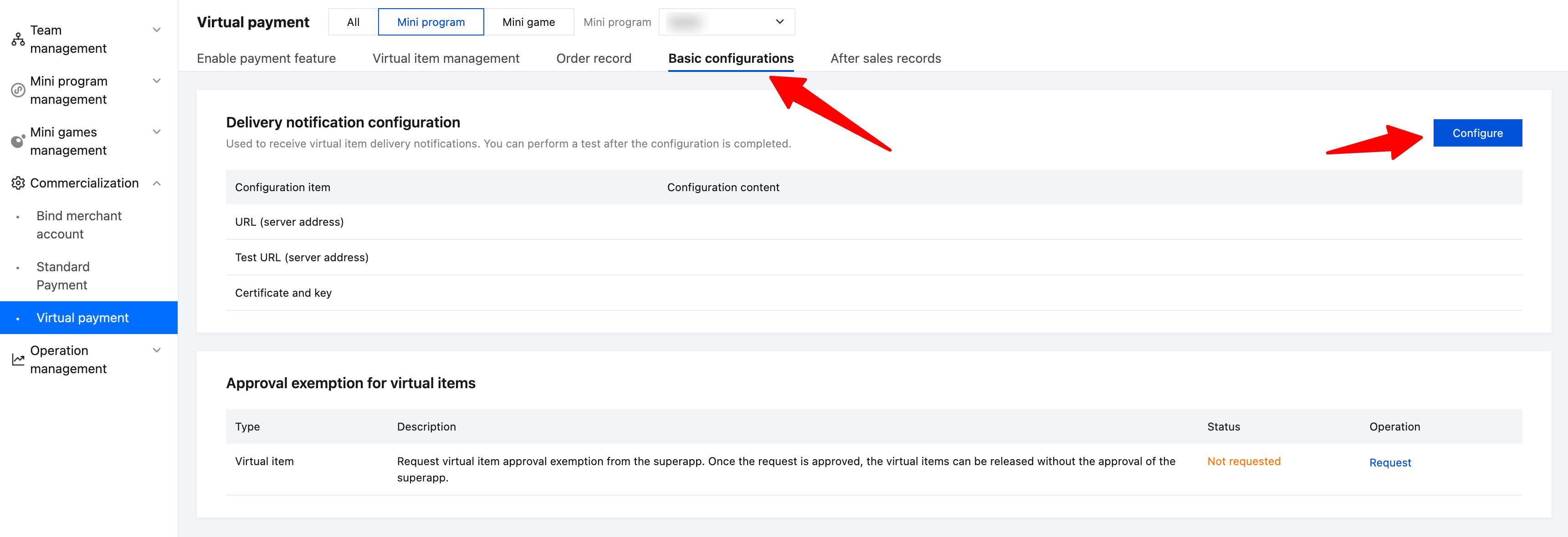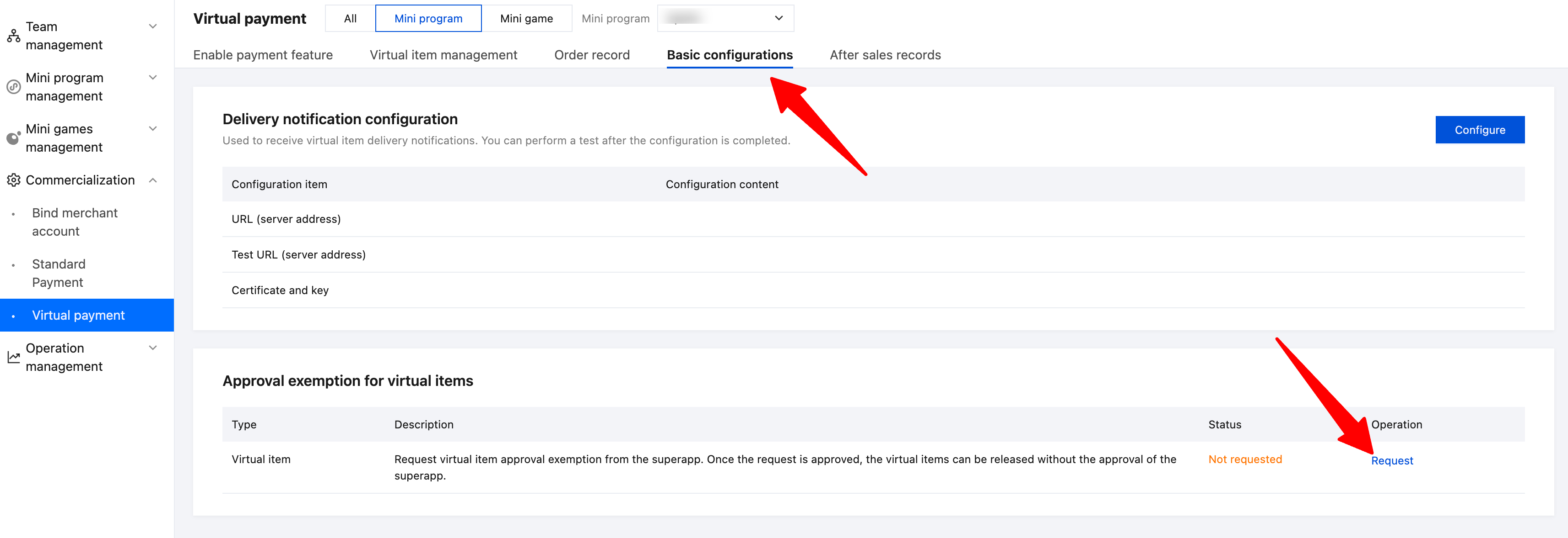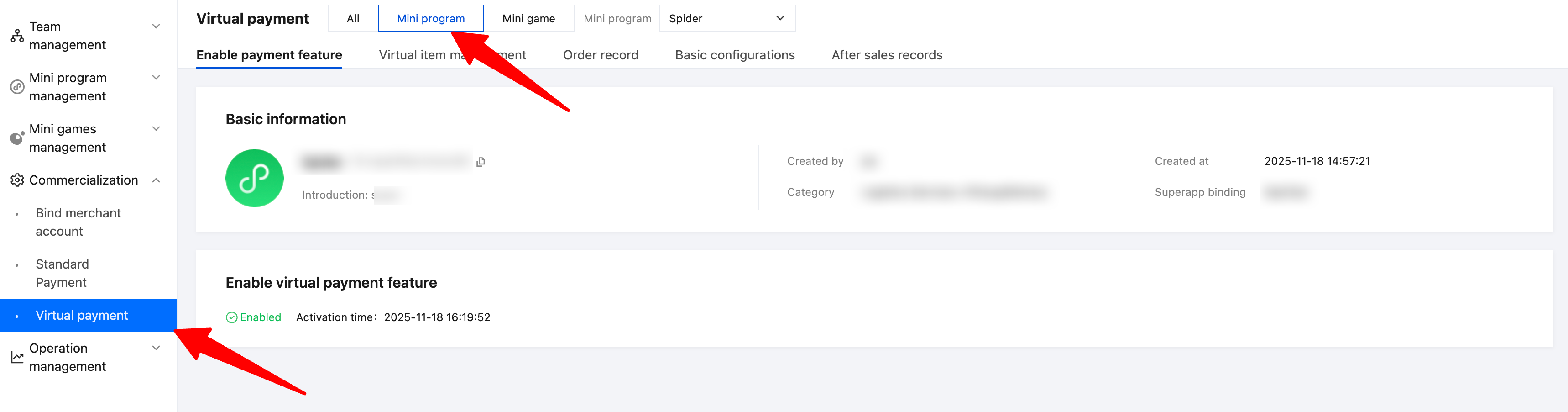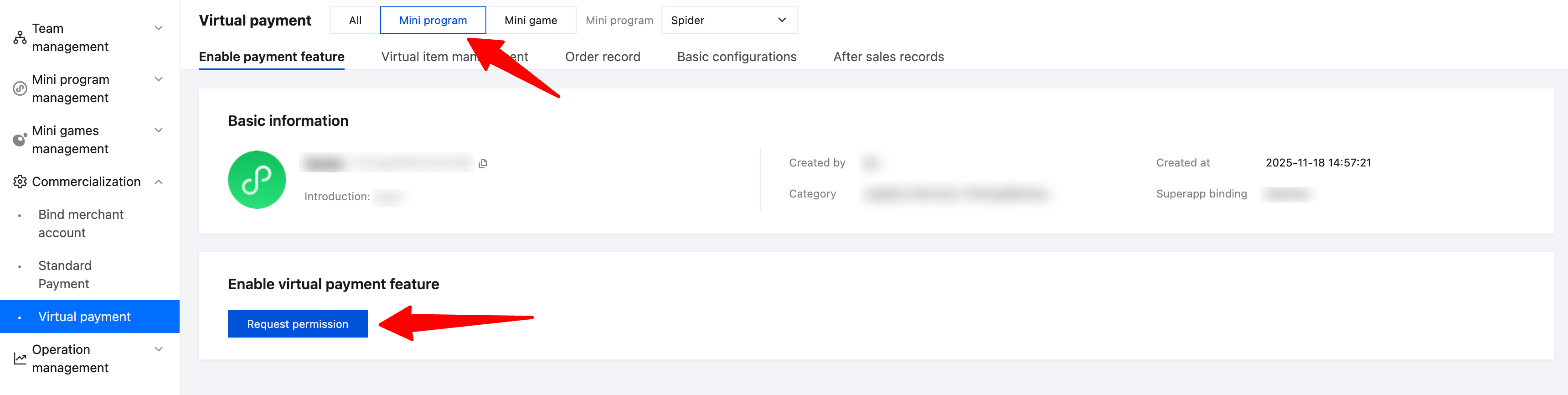 在团队绑定了商户号后,如果团队内的小程序需要使用虚拟支付,则需要由小程序团队管理员在“商业化-虚拟支付”模块下,单独为小程序向 superapp 申请开通支付功能,superapp 审批通过之后,小程序才可调用 superapp 提供的虚拟支付能力。