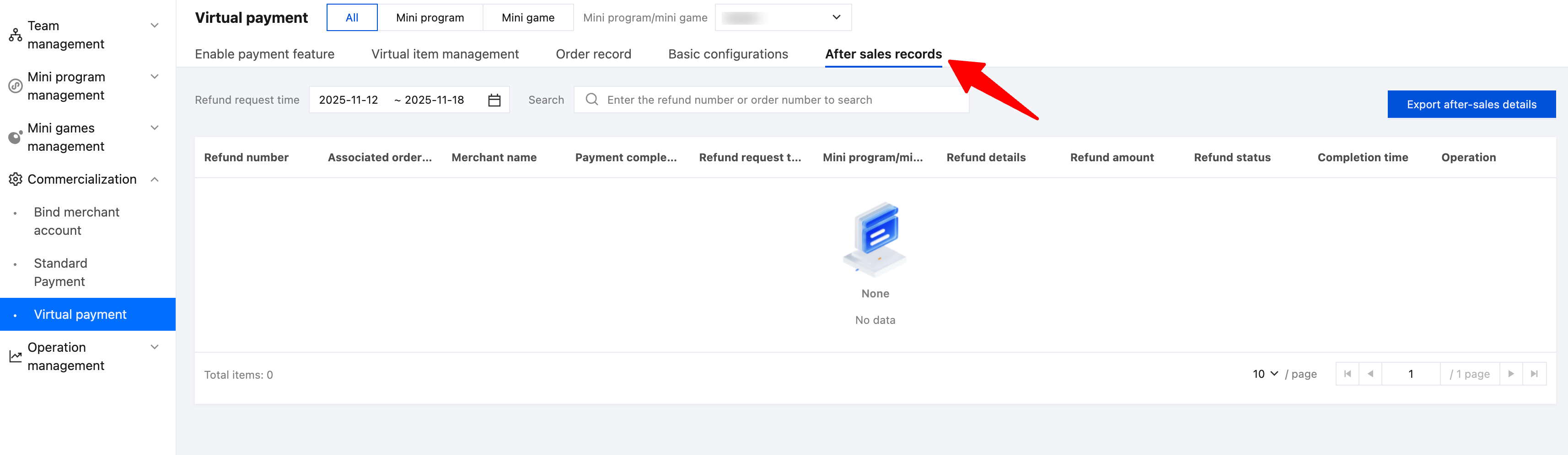 C 端用户可发起虚拟支付订单的退款,退款单生成后,可在商业化-虚拟支付-售后记录中查询。可通过退款发起时间(默认最近7天)来查询数据,最多支持查询最近12个月内的订单数据。可通过订单号或退款单号搜索退款订单,支持导出详细数据。