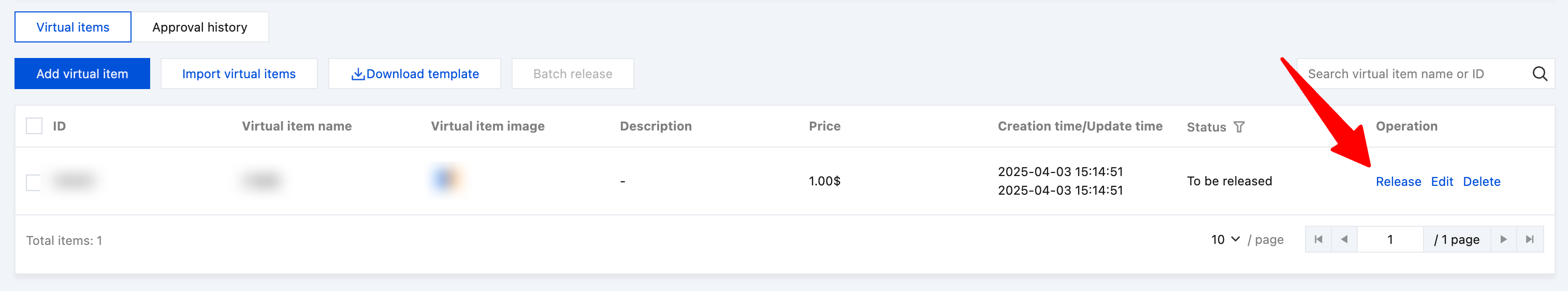 创建道具后,可以通过单个发布或批量选择发布的方式,发布游戏道具,发布后,游戏道具即可在开发者调用虚拟支付接口时被使用。