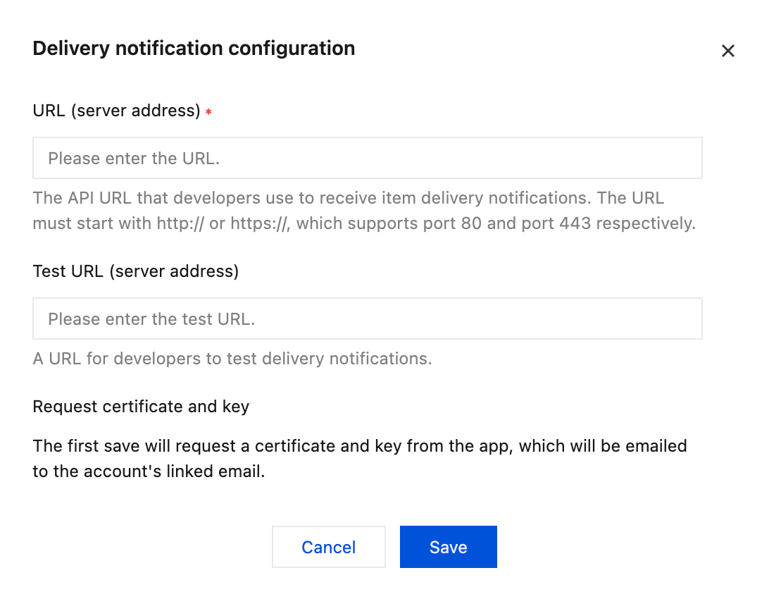 URL:开发者用来接收道具发货消息事件的接口 URL。开发者所填写的 URL 必须以 http:// 或 https:// 开头,分别支持80端口和443端口。