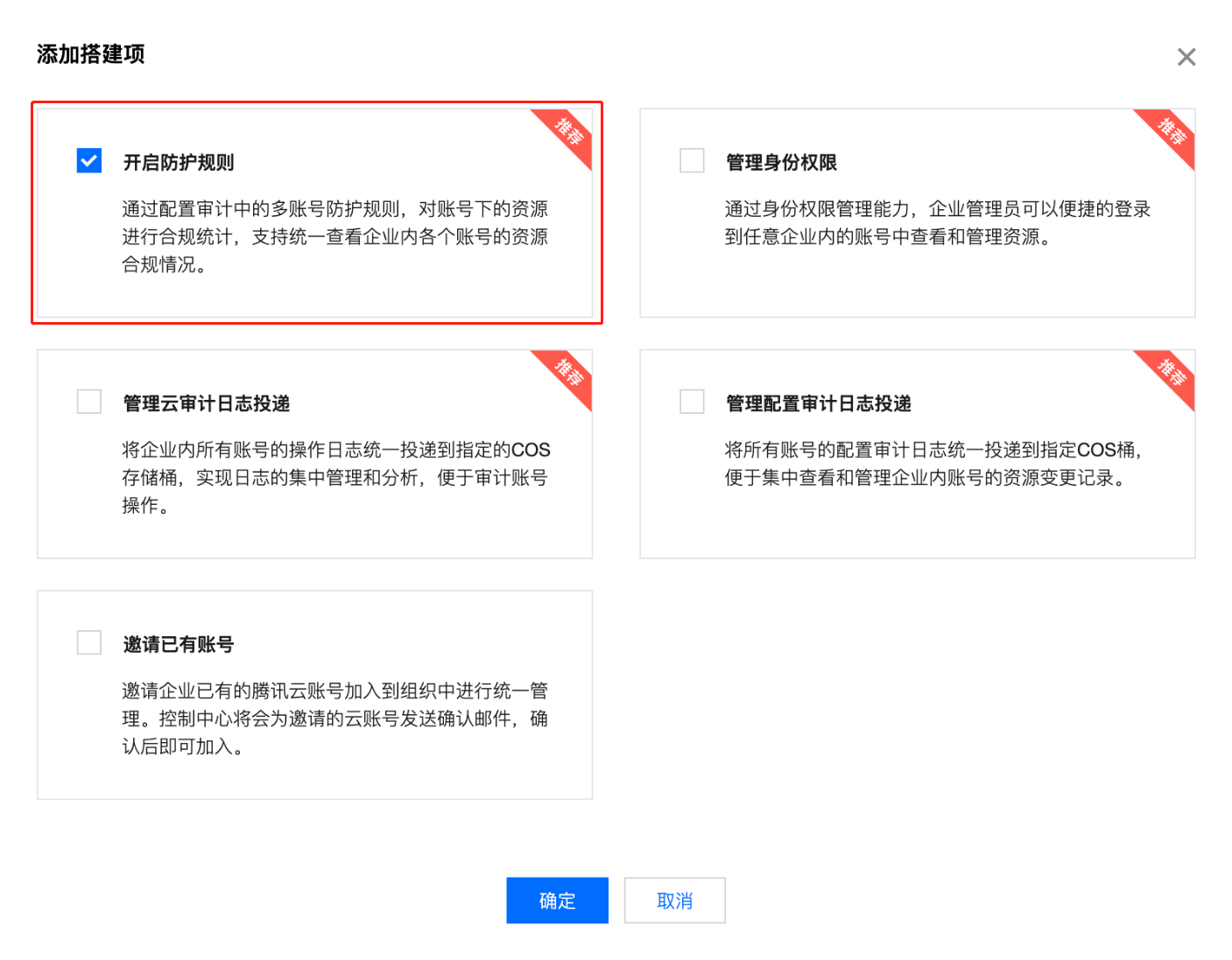 2. 在添加搭建项页面中,勾选开启防护规则,并单击确定进行添加。