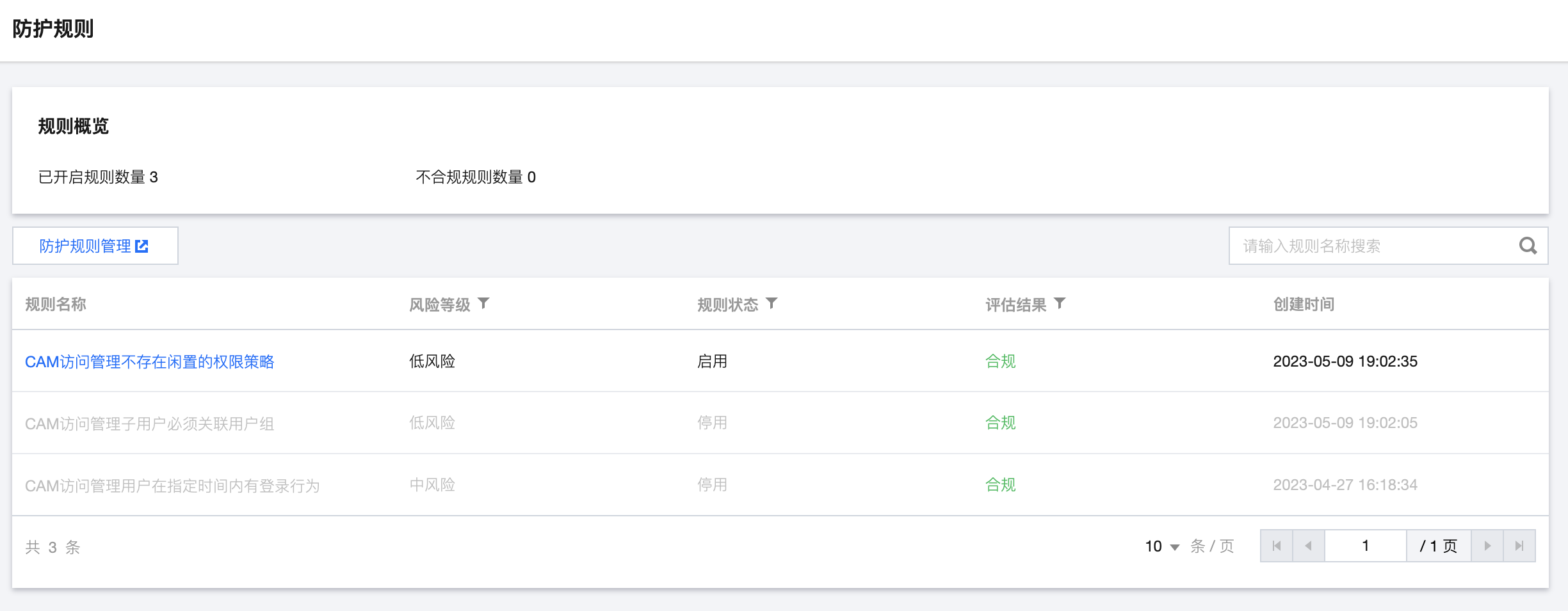 5. 执行成功后,可以在控制中心 > 防护规则中单击防护规则管理,继续在配置审计中完成具体规则设置。