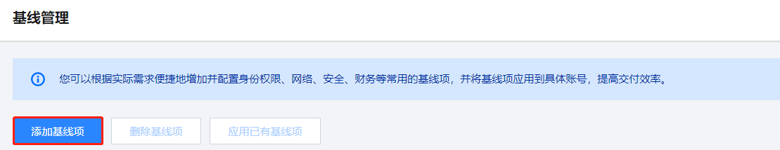 1. 登录腾讯云控制台,进入控制中心 > 基线管理 页面。 2. 单击添加基线项。