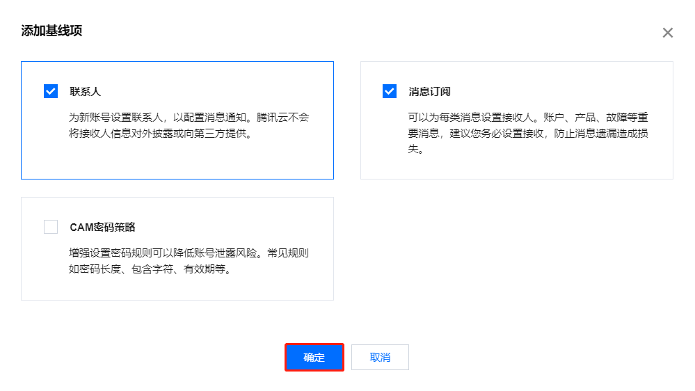 3. 选择需要添加的基线项,例如联系人、消息订阅等,单击确定完成添加。