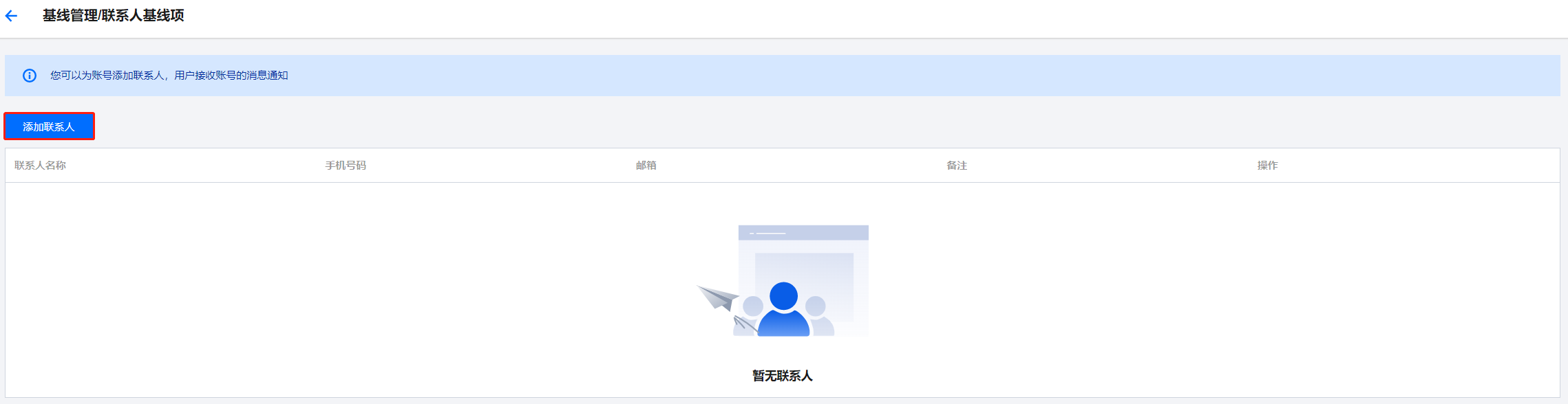 您可以为账号添加联系人,用于接收账号的消息通知。