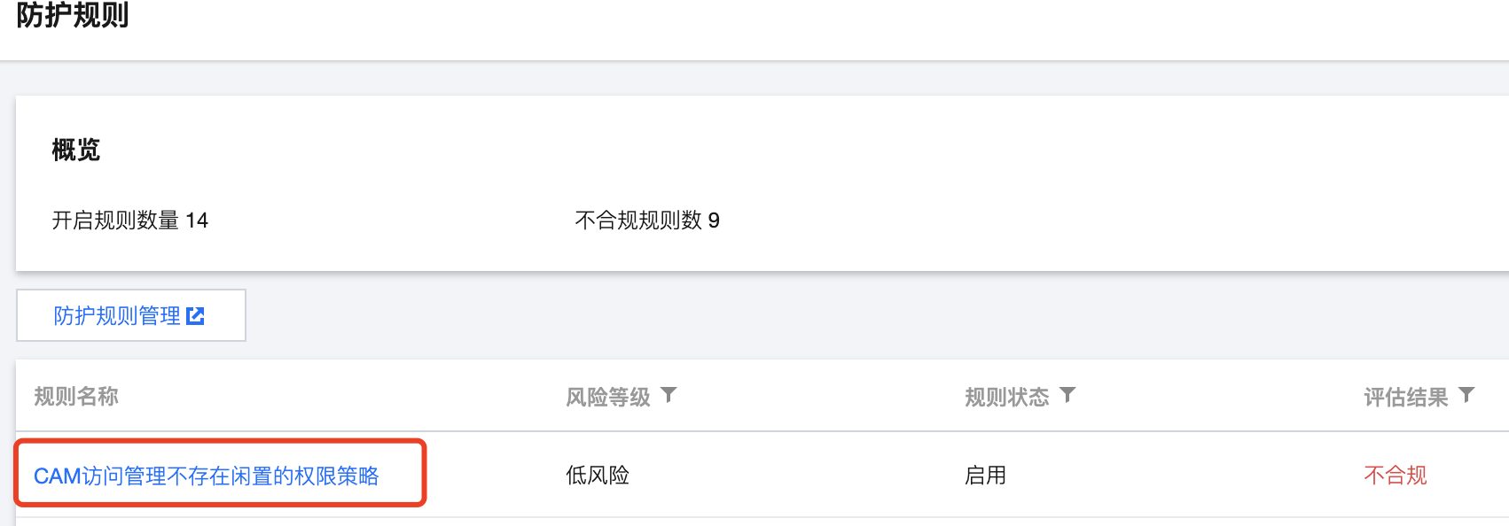 不合规规则数:系统将按照启用的规则进行防护,对评估结果为不合规的数量进行统计。