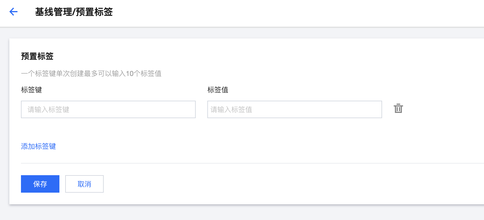 1. 在控制中心 > 基线管理 页面。单击预置标签基线项的设置。 2. 在基线管理/预置标签页面,输入标签键和和值,完成标签内容的录入。单击添加标签键,可添加多个标签键和标签值,标签策略总计不超过30个标签值。