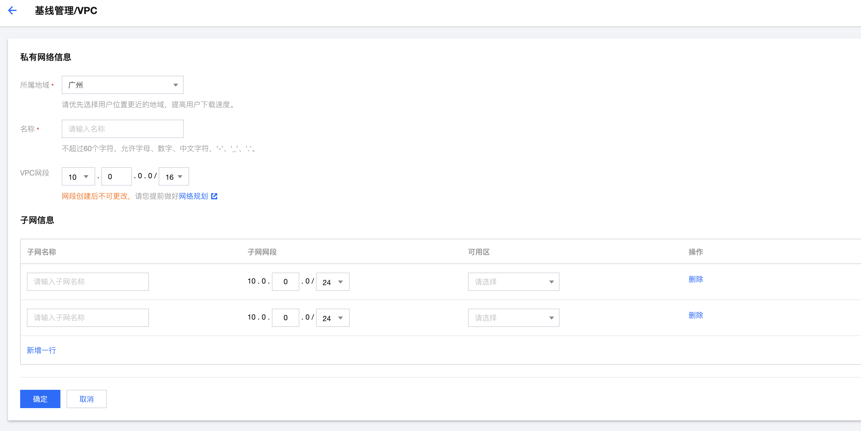 2. 在基线管理/VPC 页面,选择 VPC 所属地域,录入 VPC 名称、网段和子网信息。