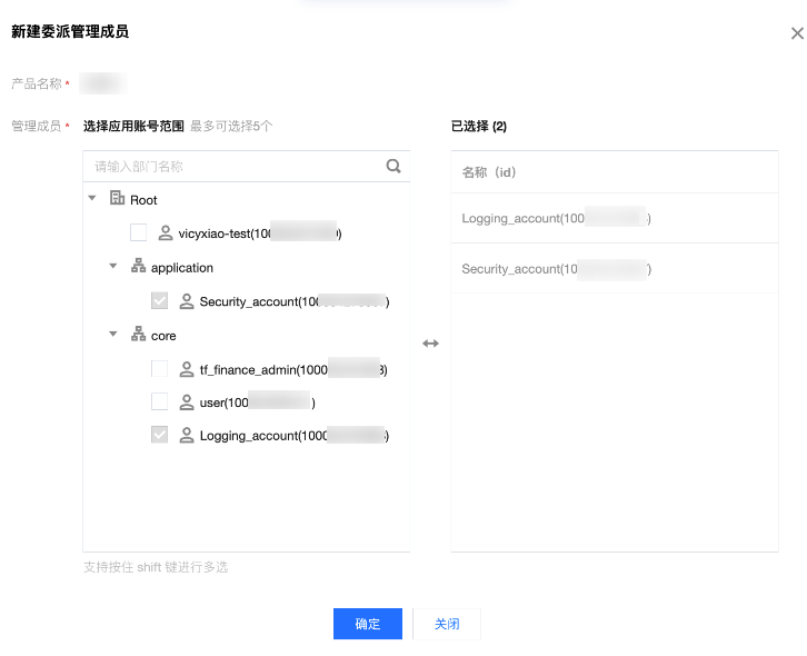 2. 选择作为日志管理账号的成员账号,单击确定完成委派。操作审计服务同样需要按照该步骤委派管理员,本文以 Logging_account 作为日志管理账号进行示例。