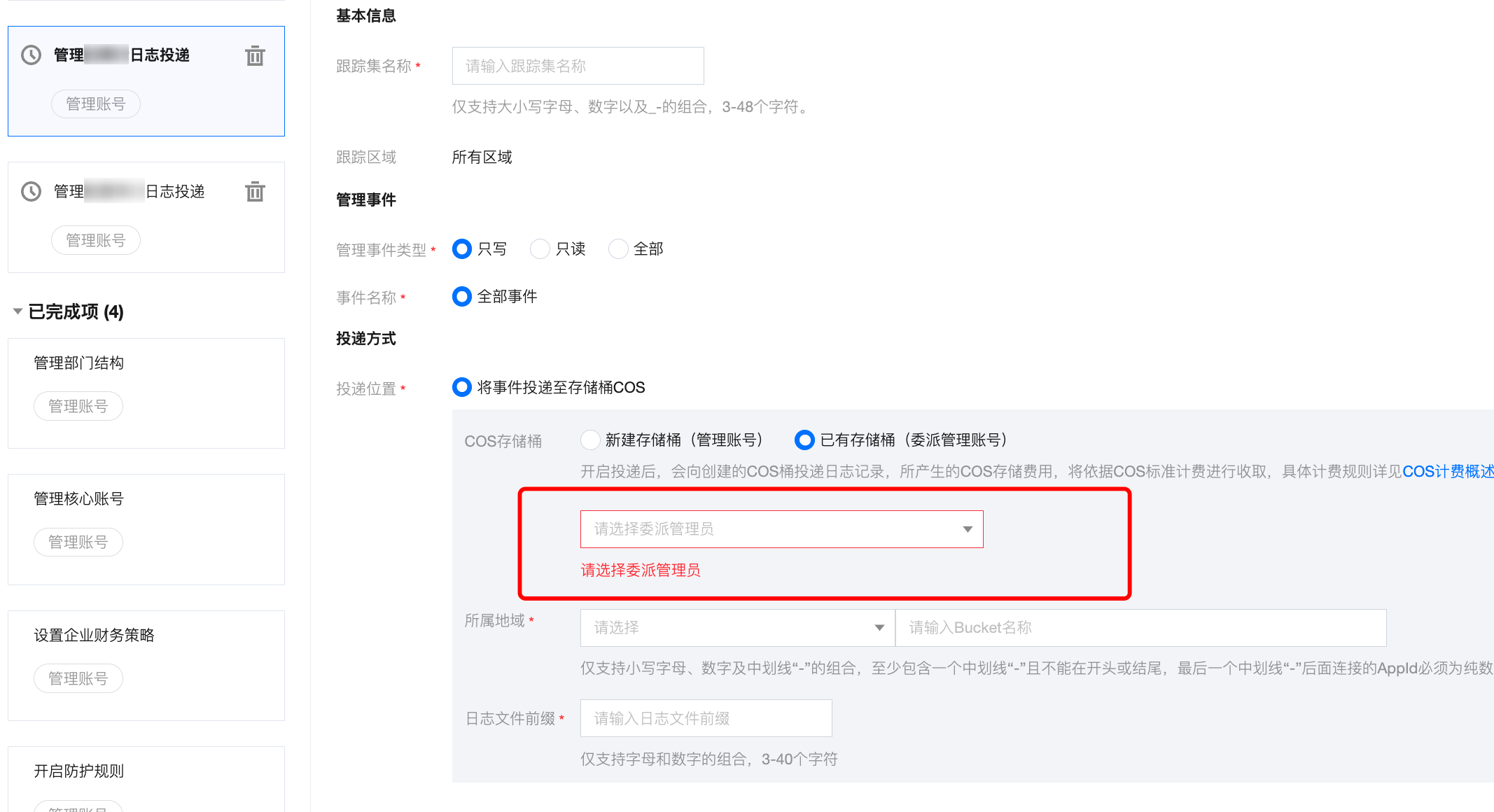 由于控制中心关联其他云产品的配置能力,对委派管理员授权使用会带来权限放大问题,后续将取消控制中心委派管理员入口。审计日志统一投递仅在配置审计、操作审计下新增委派管理员即可。
