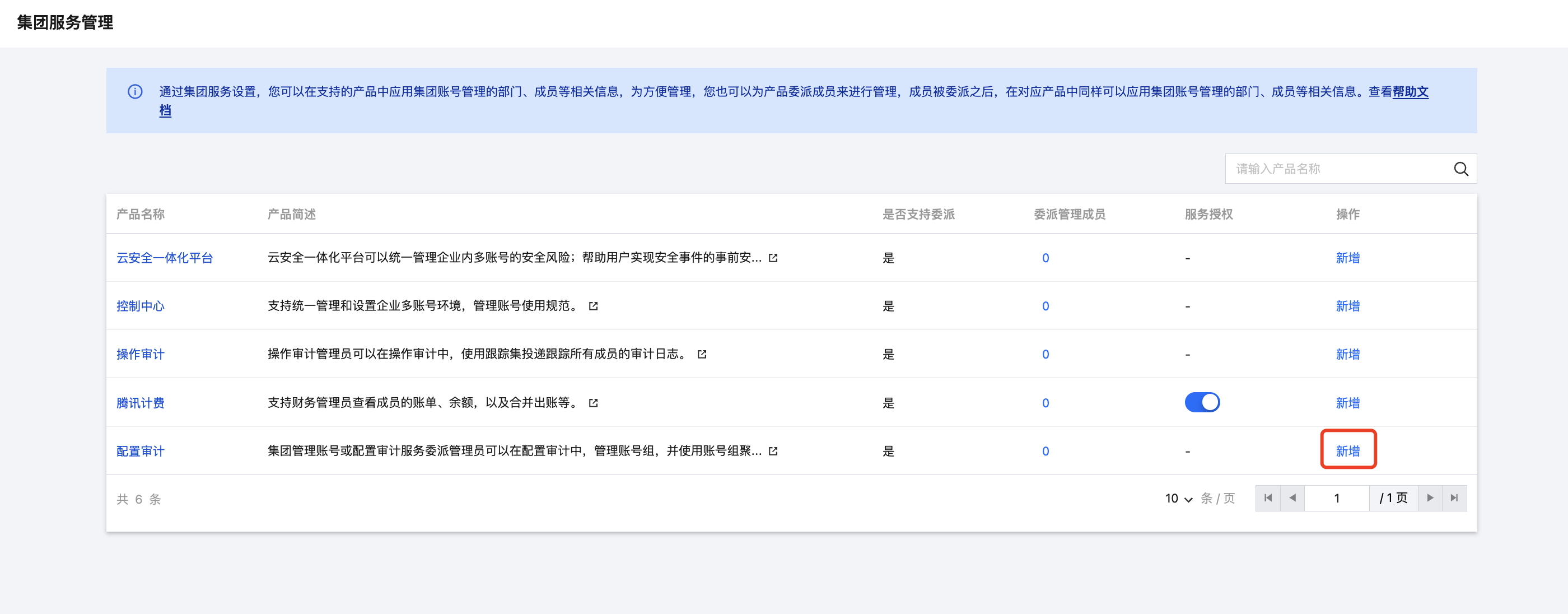 1. 进入集团账号管理 > 集团服务管理 页面,单击配置审计的新增。 说明: