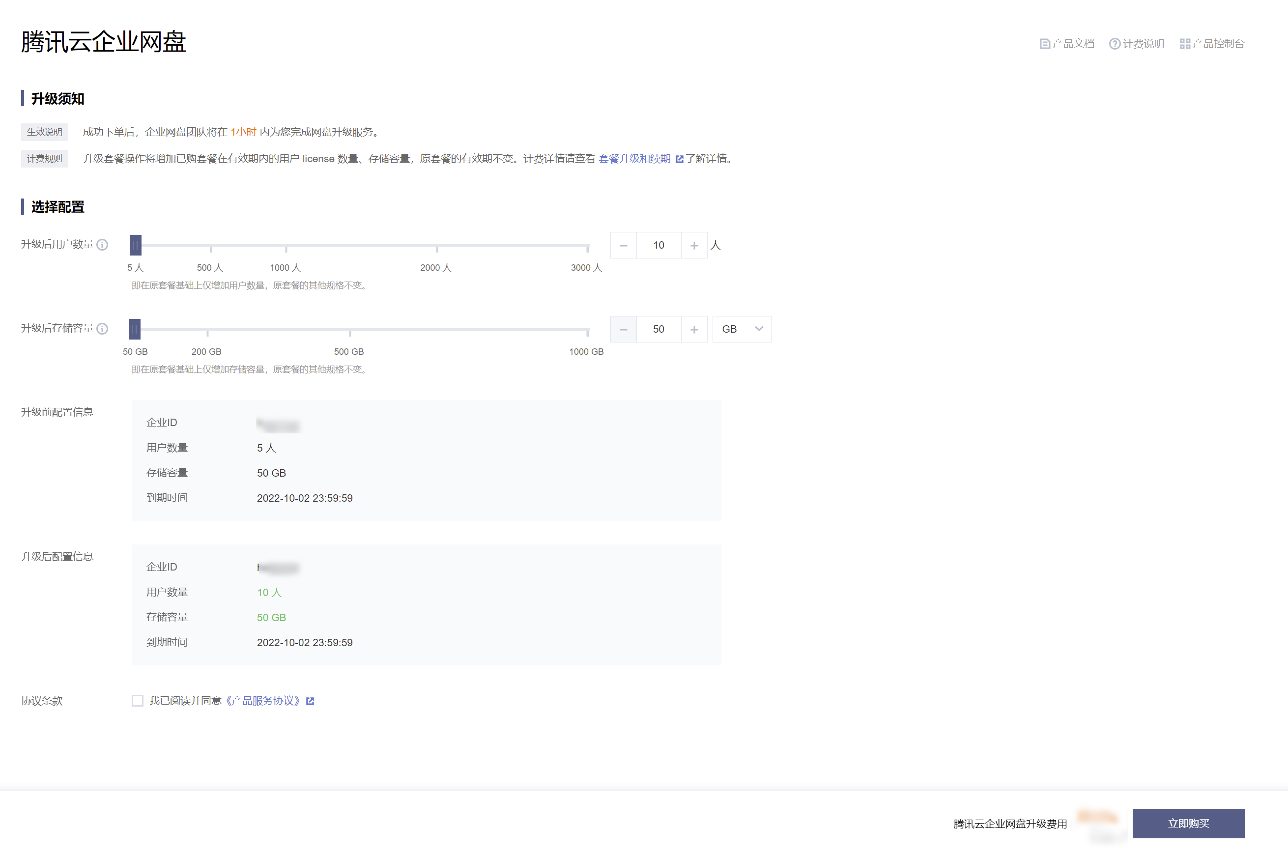 3. 进入升级配置页面。根据您的需求,您可选择仅升级用户数量(license 数量)、仅升级存储容量或同时升级。可以查看页面中的升级后配置信息部分,来了解升级后的整体套餐规格。