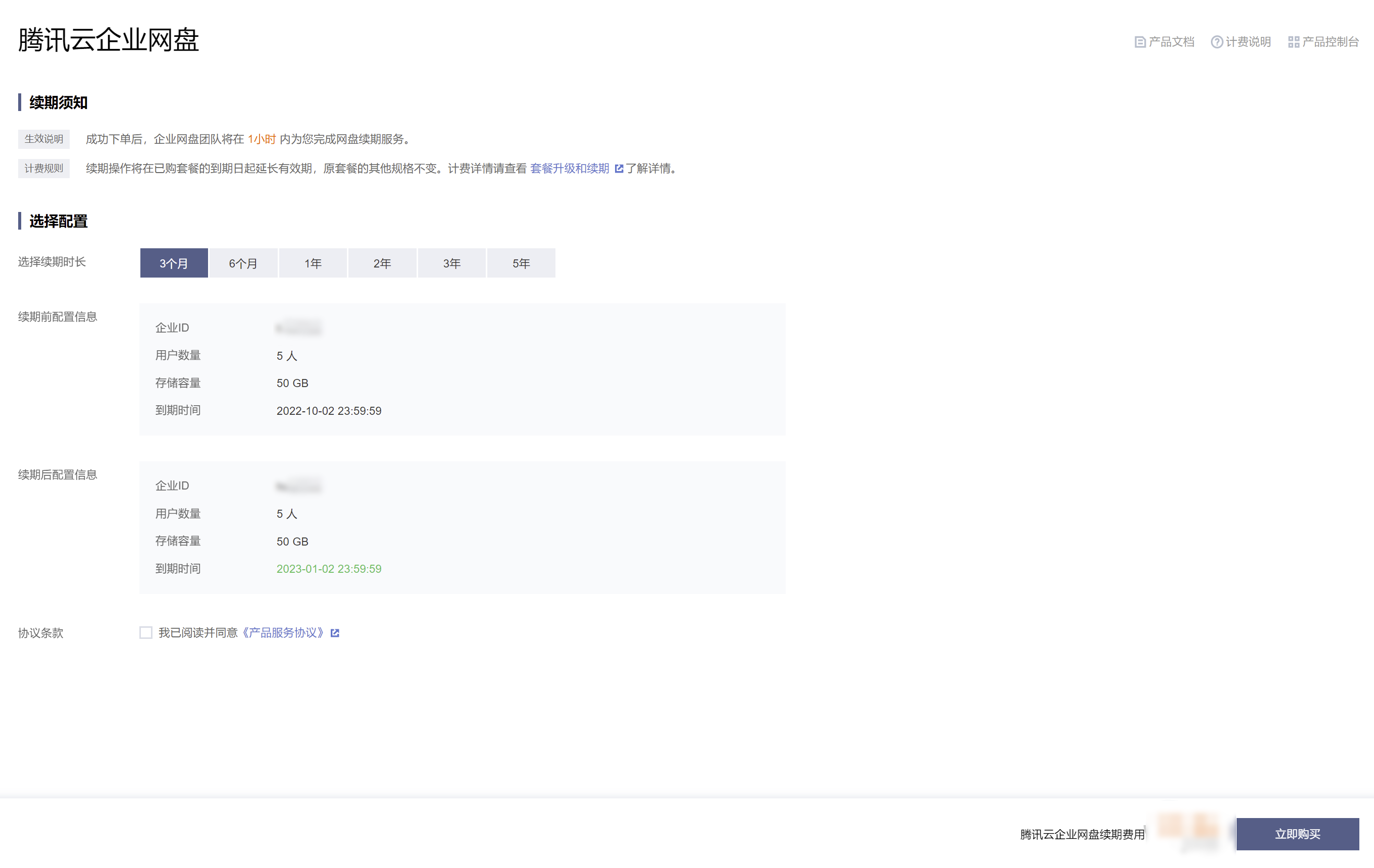 您在2021年12月01日 10:00:00购买了1个时长为3个月的企业网盘,则资源包的有效期为2021年12月01日 10:00:00到2022年03月01日 23:59:59。同时,您在2022年01月15日 12:00:00进行了续费操作,新增有效期3个月,则网盘的有效期延长到2022年06月01日 23:59:59。