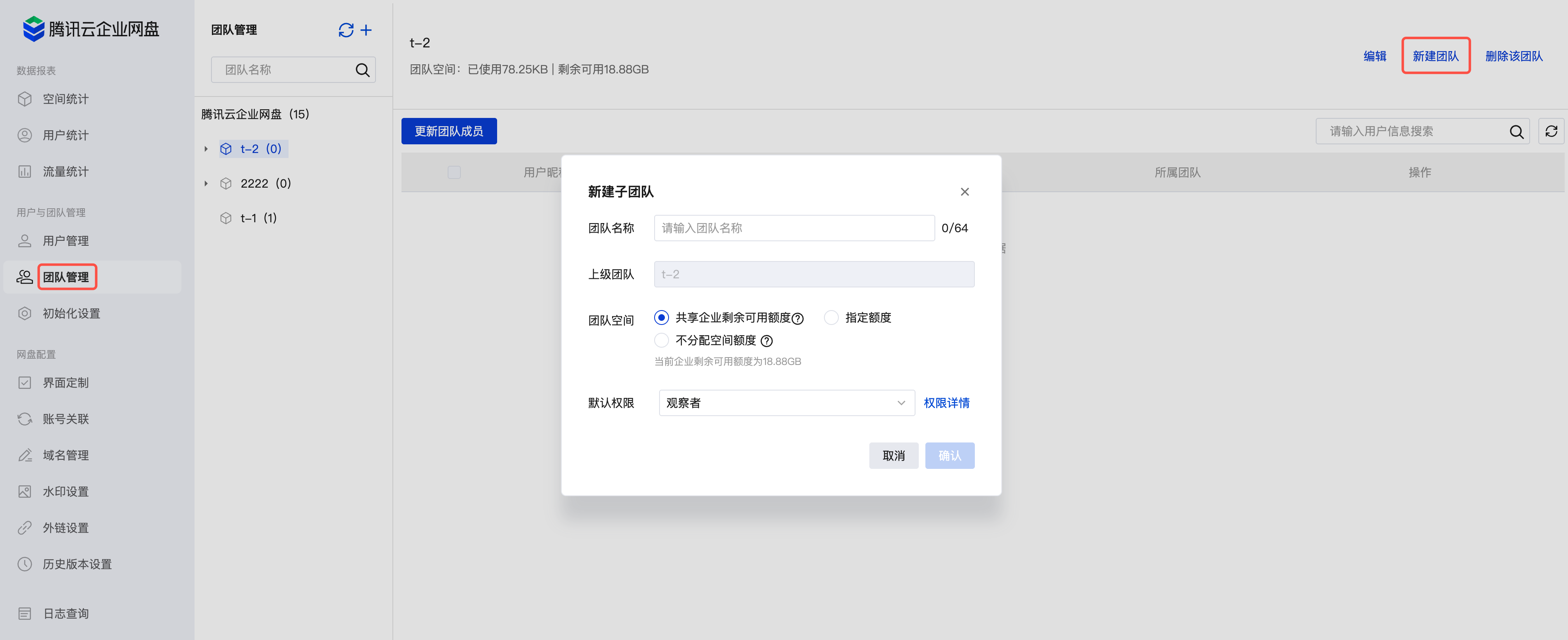 团队空间:指该团队的存储空间额度;需小于剩余可分配额度。
