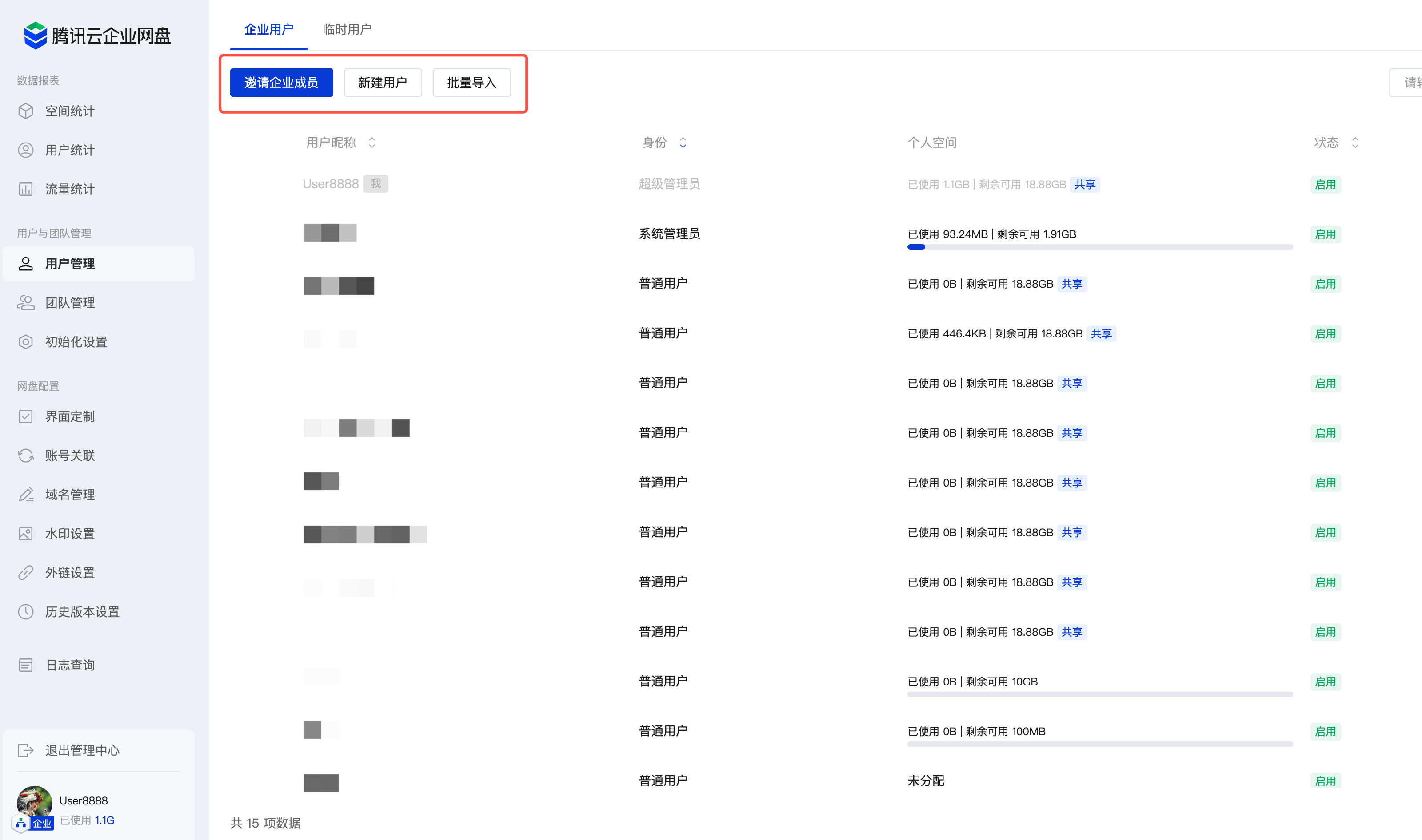 3. 可通过多种方式添加用户,单击邀请企业用户、新建用户、批量导入进行操作。