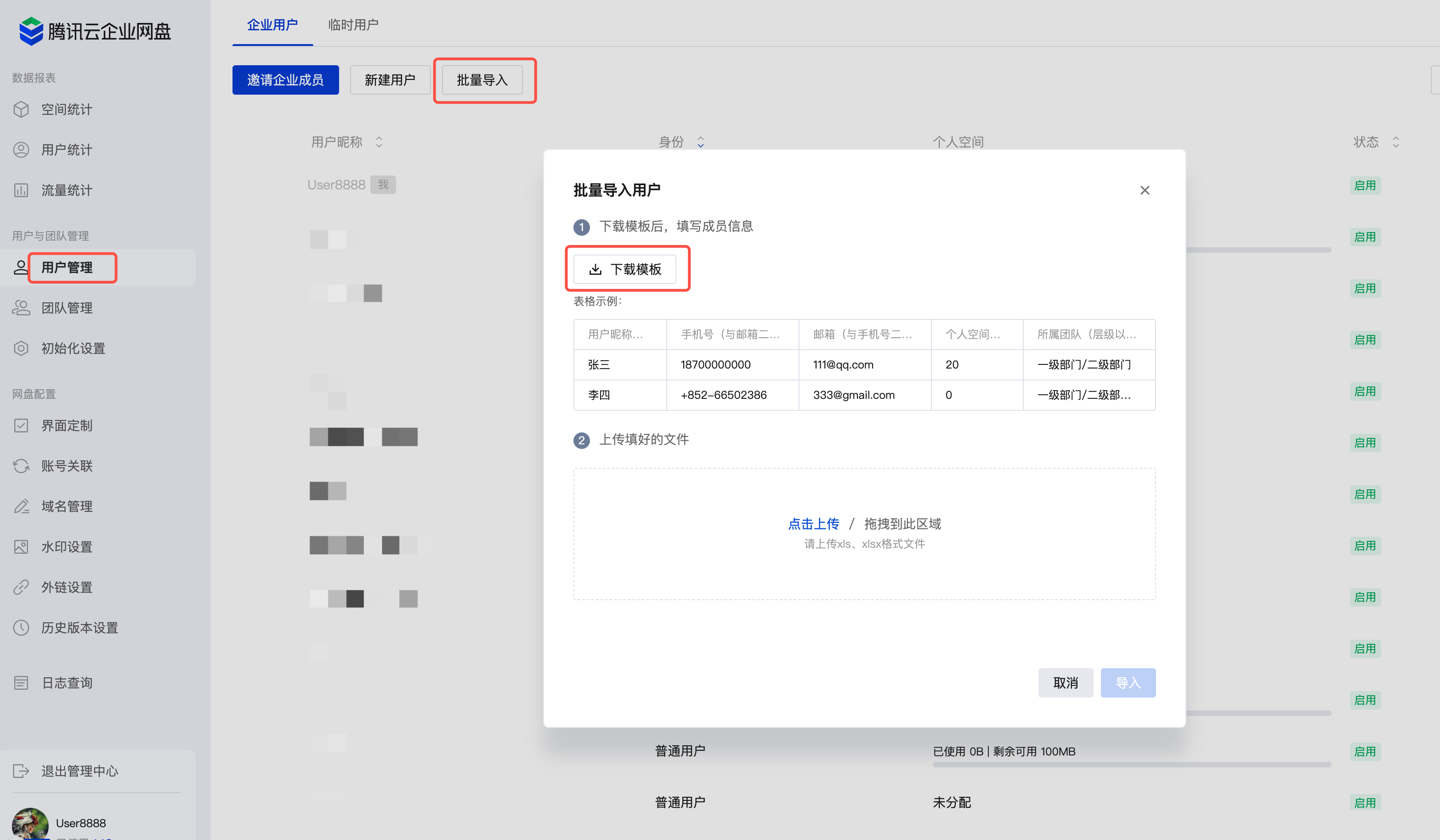 批量导入:单击批量导入 > 下载模板,打开下载的表格,填写用户昵称、手机号、个人空间分配、所属团队等信息,上传表格,单击导入,即可完成用户导入和团队创建。