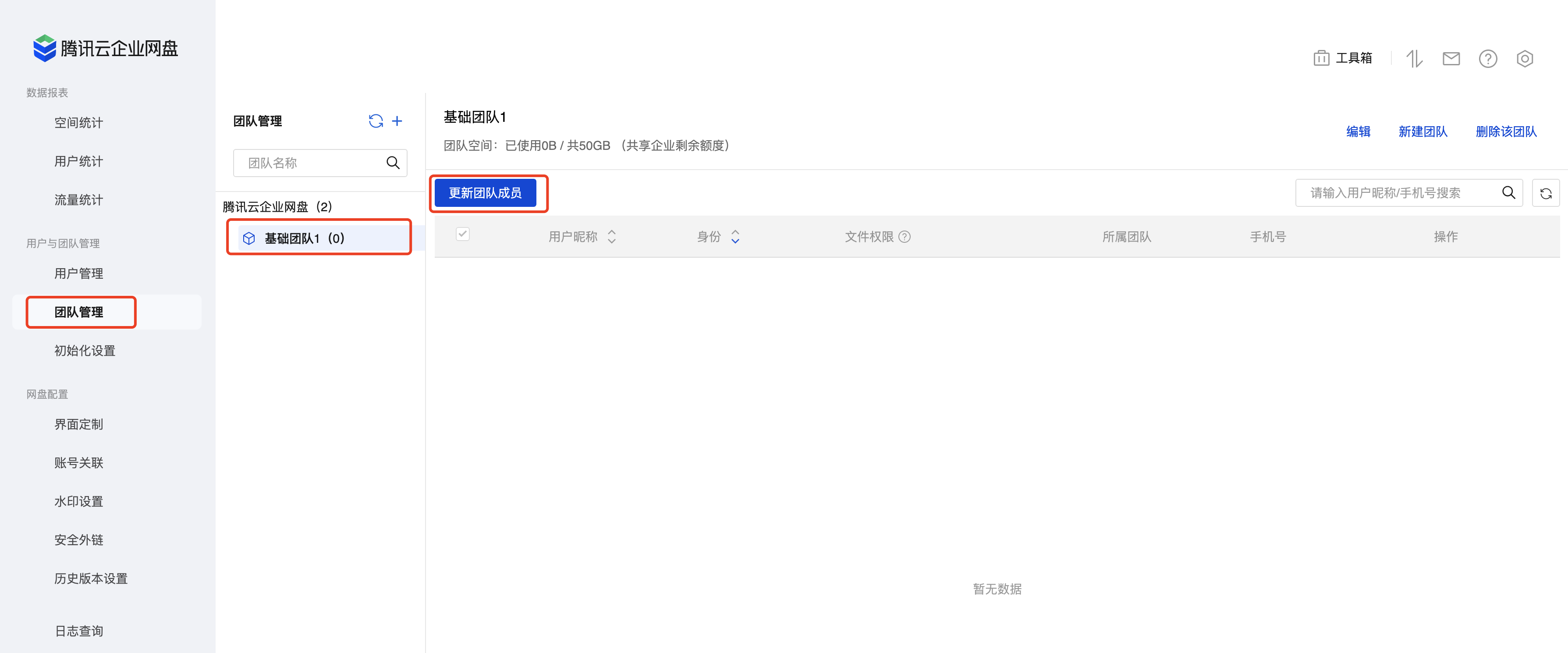 5. 单击用户和团队管理 > 团队管理,进入团队管理页面,所有已添加用户将自动加入企业根目录中。