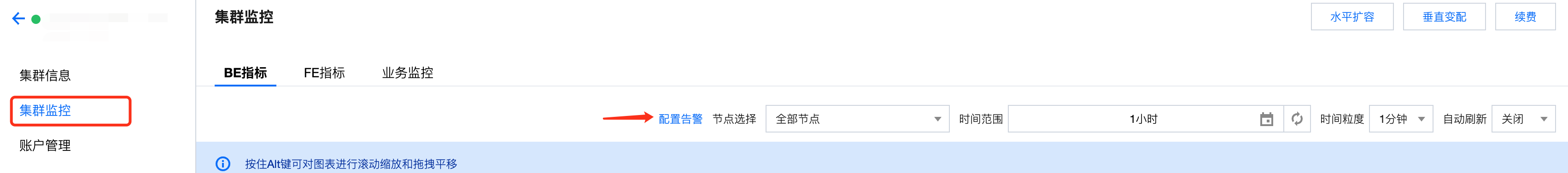2. 支持创建灵活全面的报警策略,可以对所有监控指标进行异常告警。在集群监控页面内,单击配置告警可新建告警策略。