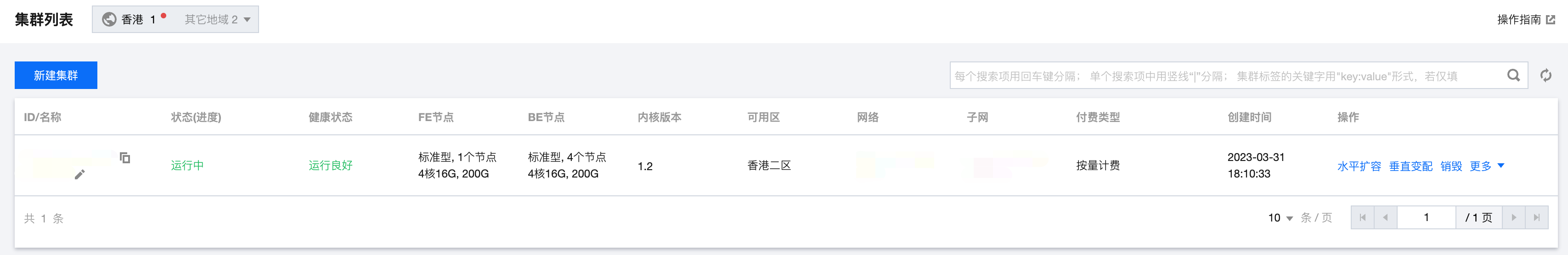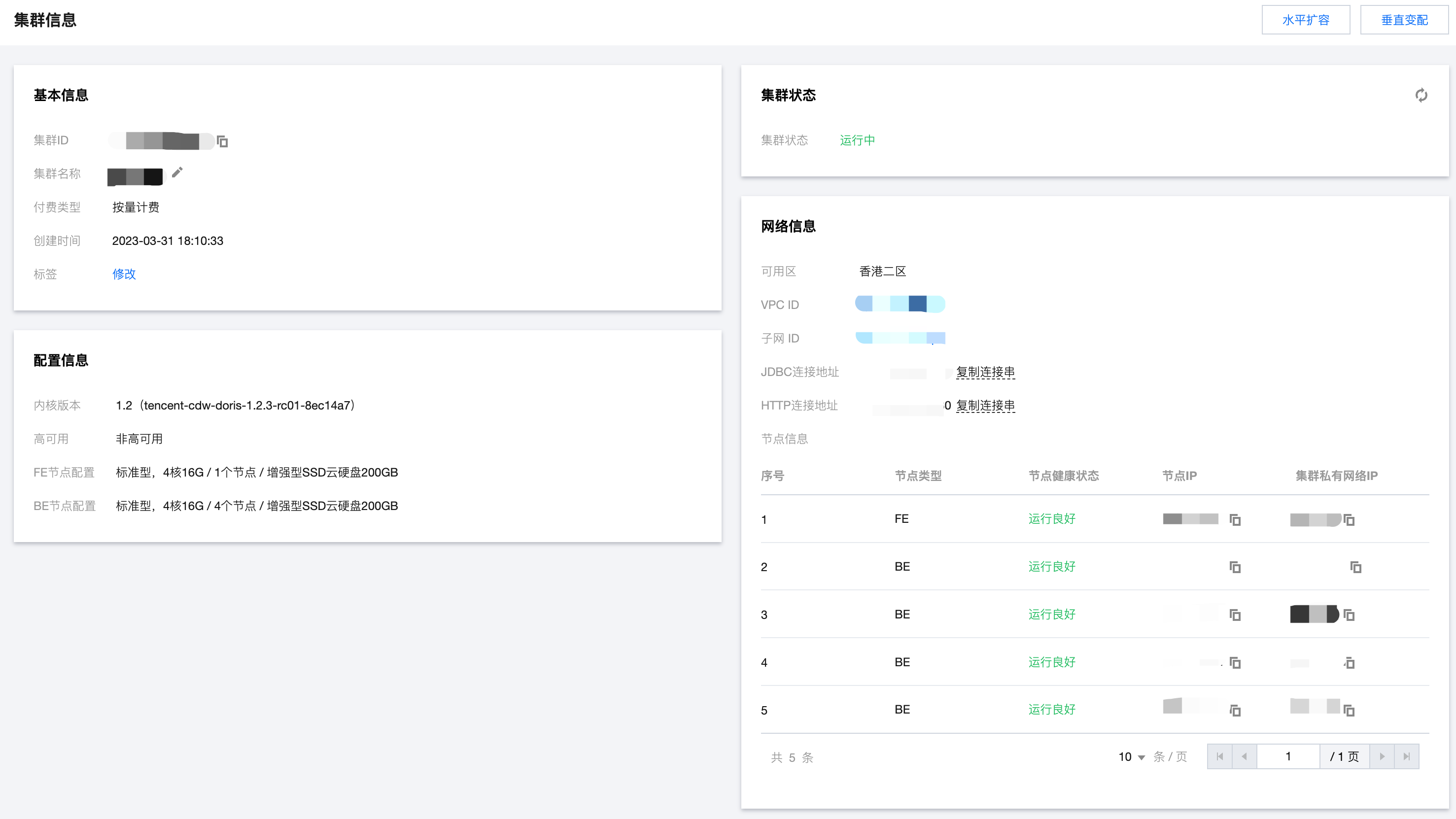2. 在集群列表单击 集群 ID/名称,可以查看集群基本信息、集群状态、配置信息和网络信息等。