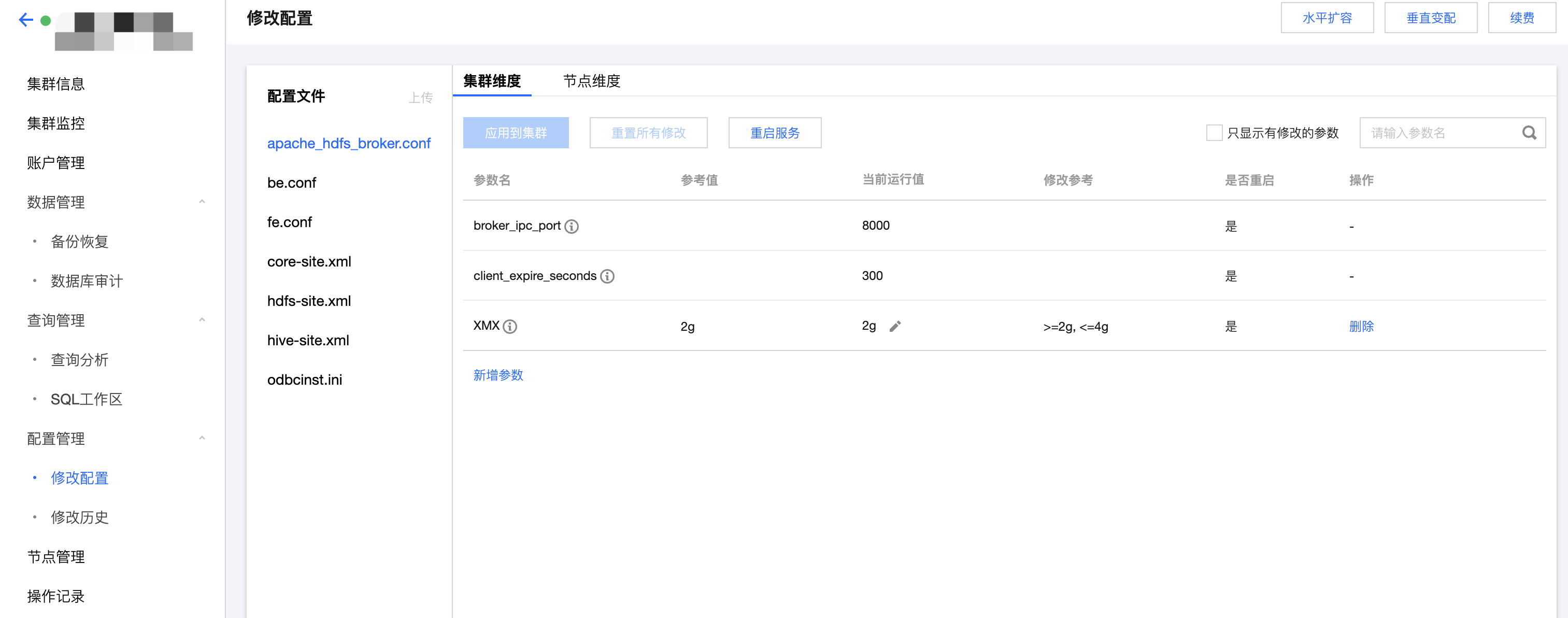 1. 腾讯云数据仓库 TCHouse-D 支持灵活的参数配置方式,您可以在控制台中全面、直观地设置 BE/FE/Broker 等参数,并支持查看历史修改记录。在集群列表中单击集群 ID/名称查看集群详情,在左侧列表中选择配置管理 > 修改配置进入参数配置页。