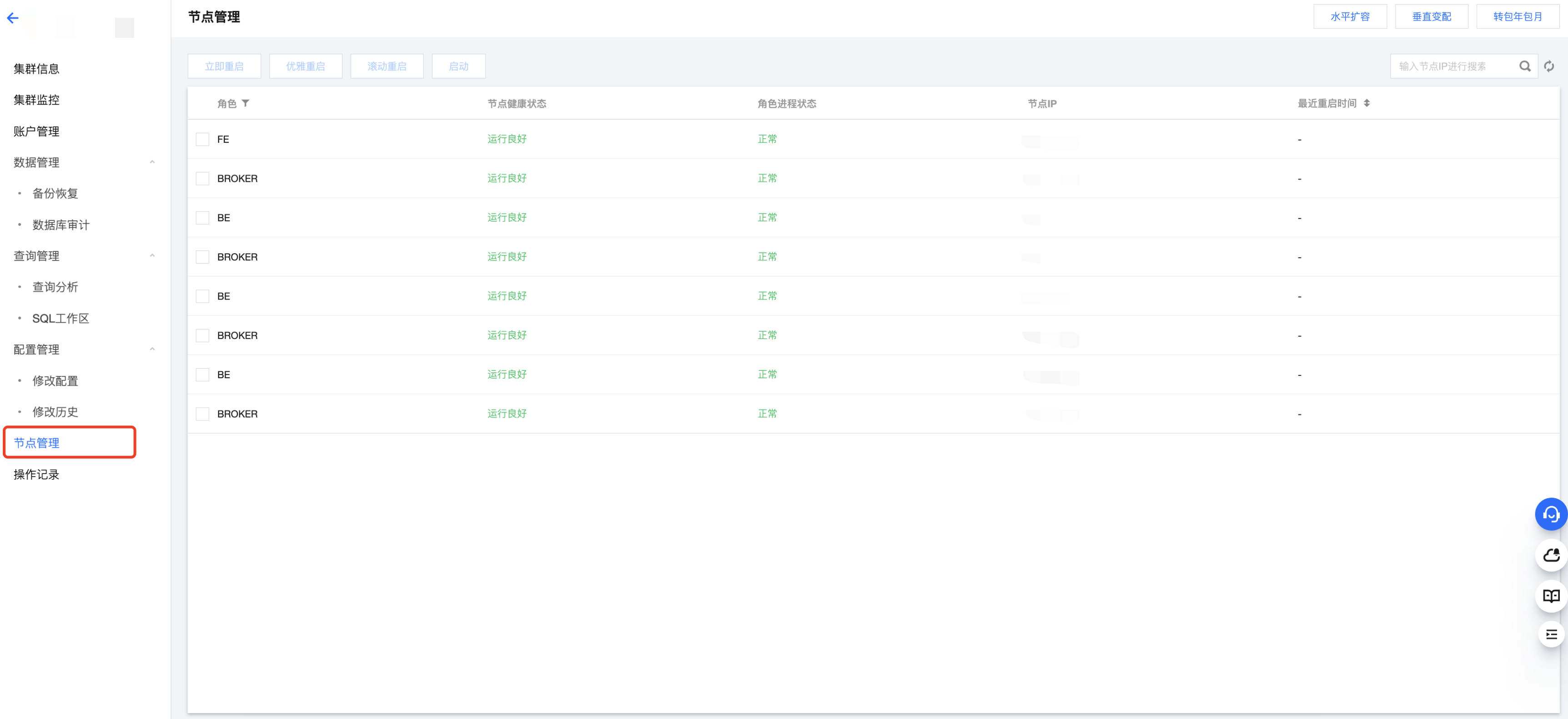 1. 节点管理页面展示集群中各角色的状态列表,角色包含 FE、BE、BROKER。对每个角色,会展示健康状态、进程状态、节点IP及最近重启时间(在角色管理页面最后一次手动进行服务重启操作的时间)。