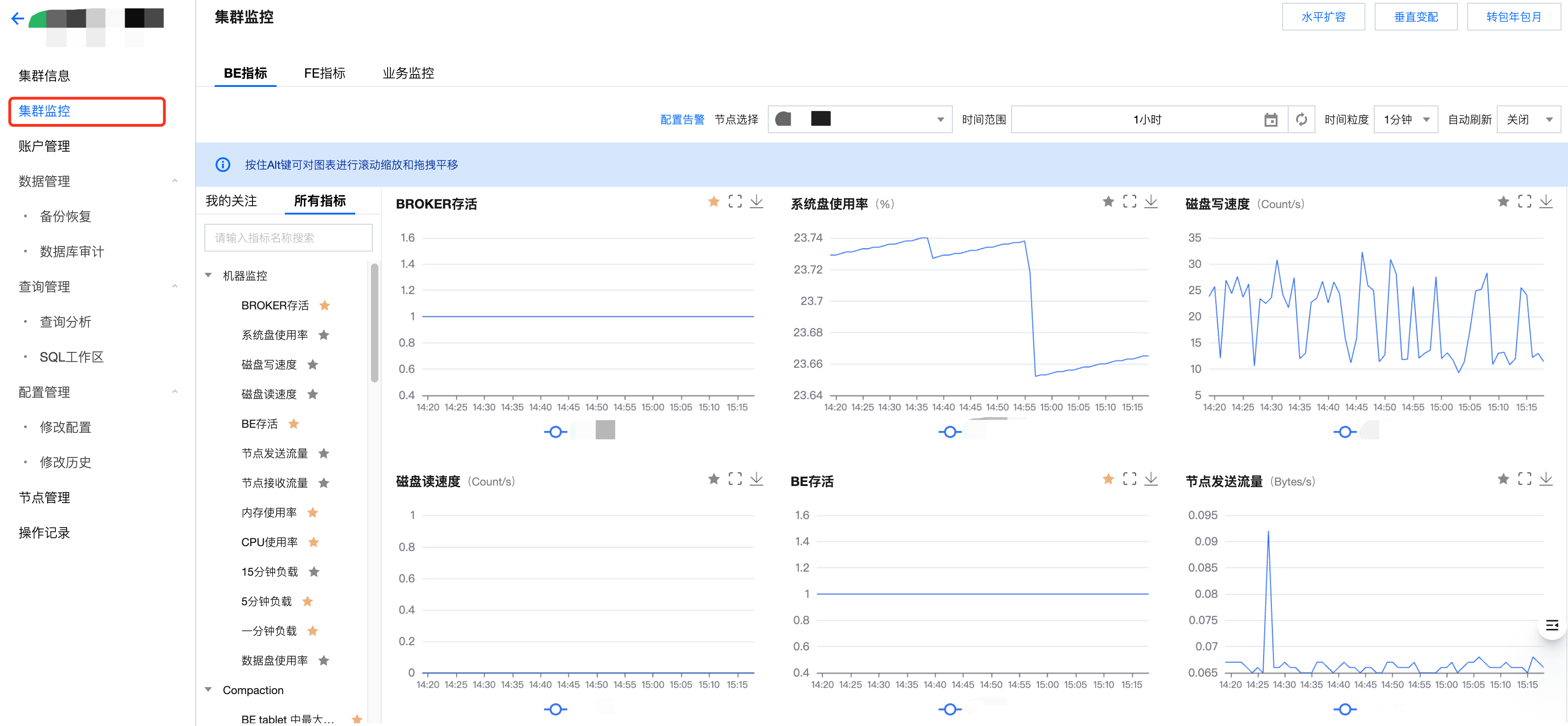 1. 腾讯云数据仓库 TCHouse-D 提供了丰富的监控指标,方便您掌握集群的运行状态,并可针对指标配置告警以实时关注运行信息,实现快速响应。单击集群 ID/名称进入集群详情页,单击集群监控可查看集群的各项性能指标。