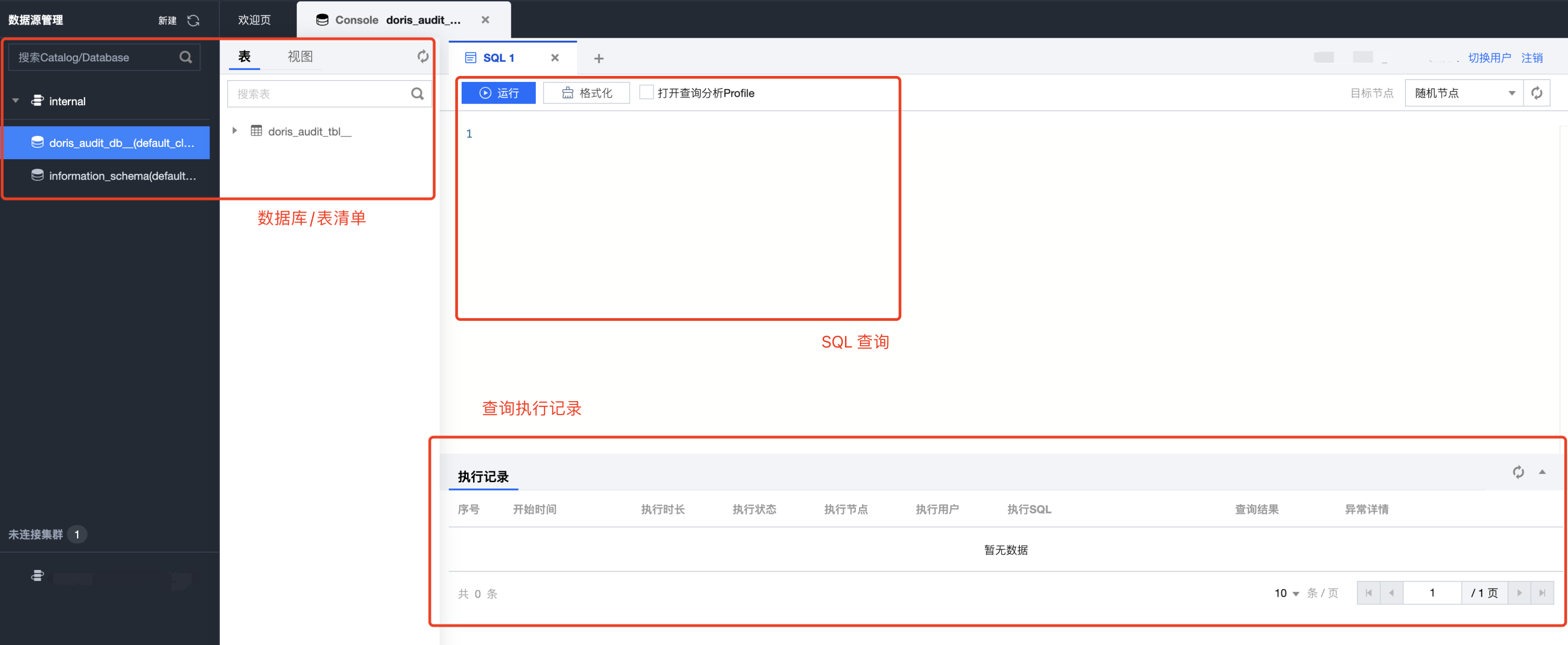1. 通过 SQL 工作区,您可以快捷地连接集群,使用 SQL 命令开展一系列操作,详情参见 SQL 工作区。在控制台左侧列表单击即可访问 SQL 工作区。在集群列表中选中目标集群 ID/名称,在查询管理下也可找到入口。 2. 在 SQL 工作区内,您可以执行 SQL 语句,查看执行记录等操作。
