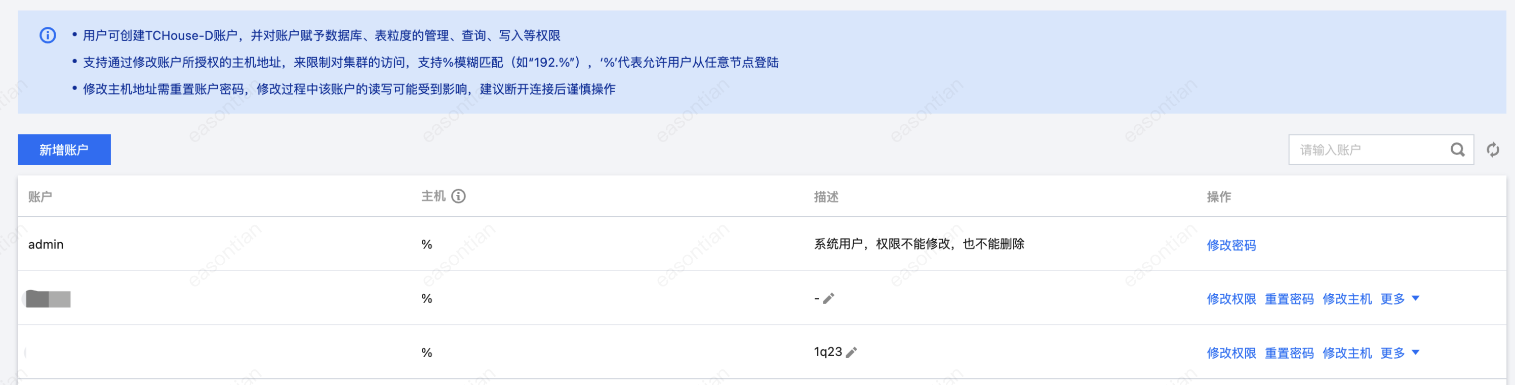 1. 腾讯云数据仓库 TCHouse-D 在控制台中提供了一个可视化界面,能够对集群便捷、高效地开展账户管理、权限管理操作。