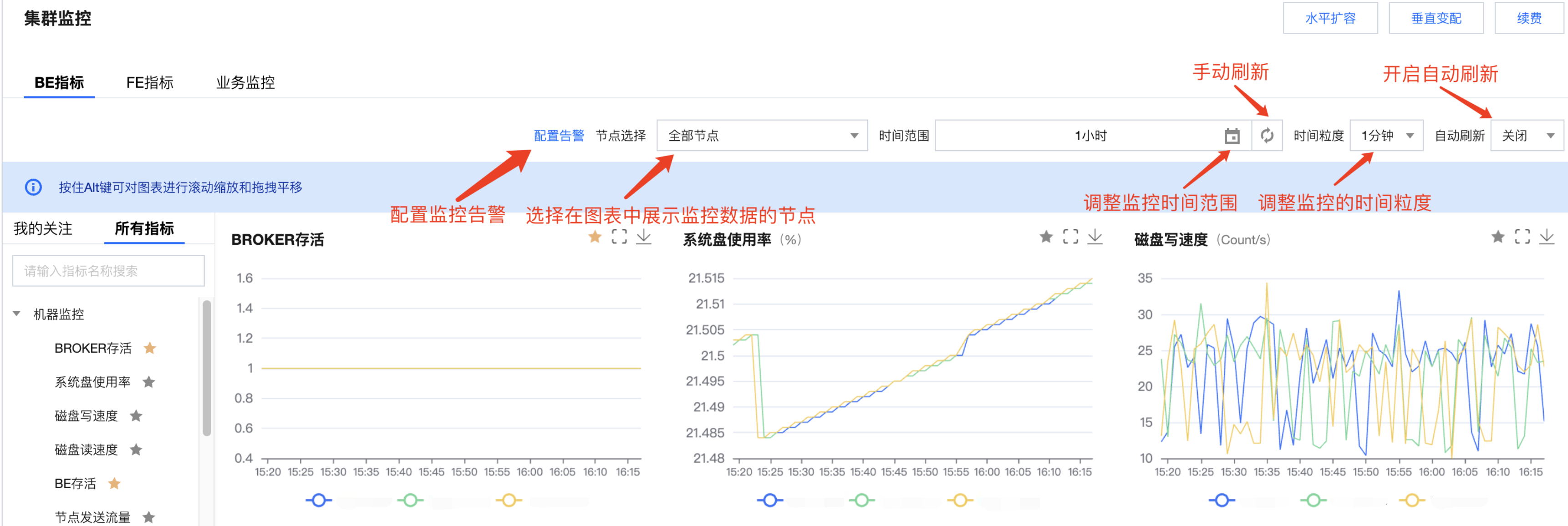 监控页面支持开启自动刷新,根据用户选择的刷新间隔自动更新监控图表,实现数据的实时查看。