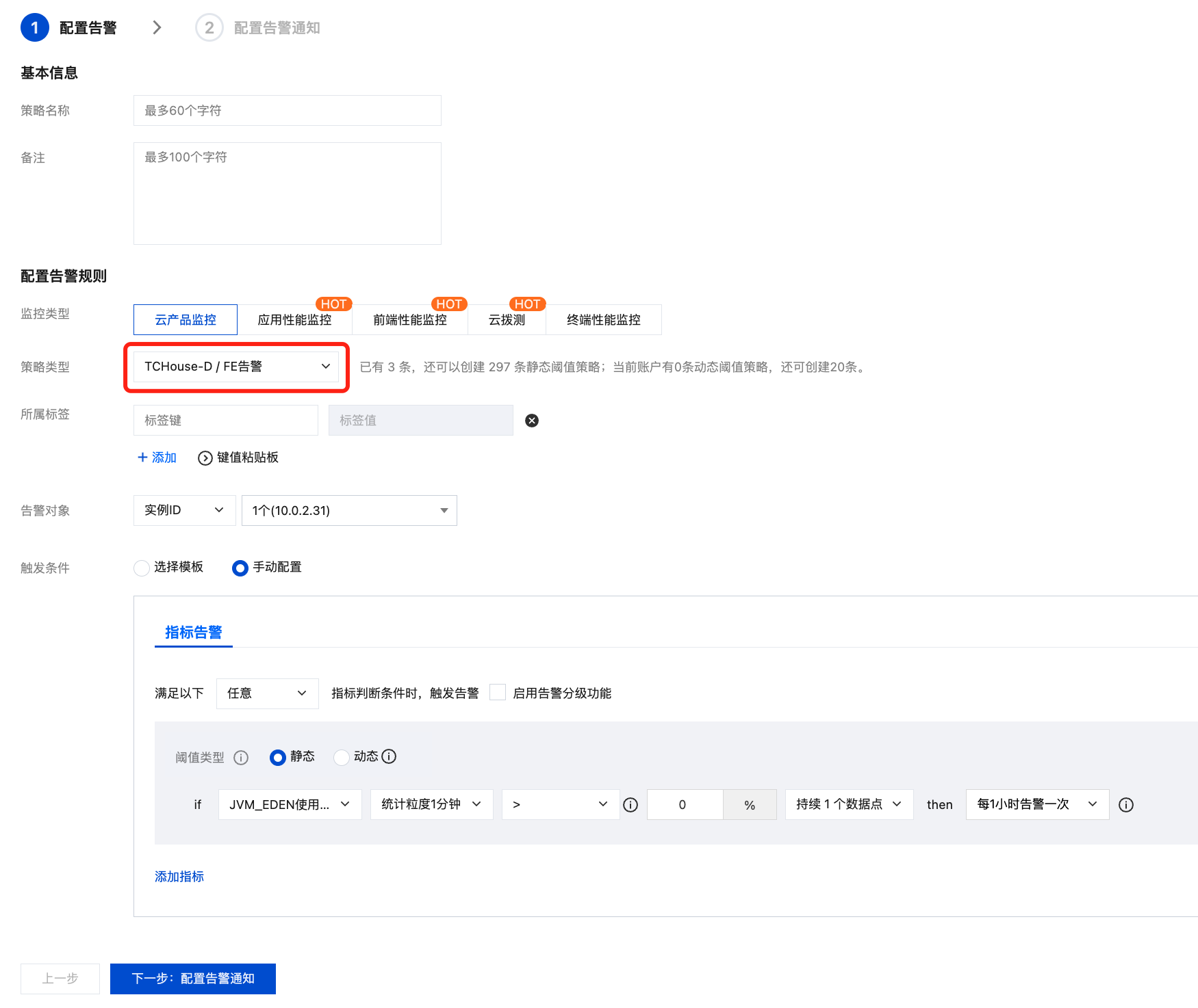 对业务监控指标配置监控告警时,您需要在策略类型中选择“TCHouse-D / FE告警”,原因是该类指标的监控事实上依赖 FE 节点。