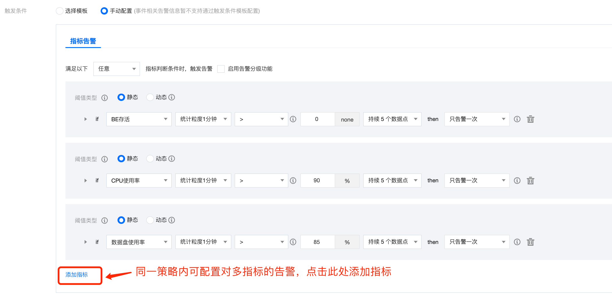 告警规则支持单指标或多指标复合条件。每个指标可自定义不同时间粒度下的告警条件。