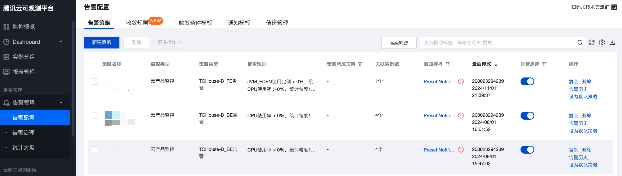 告警配置完成后,您可在腾讯云可观测平台 > 告警管理 > 告警配置中查看已有的策略,按需随时调整告警策略。