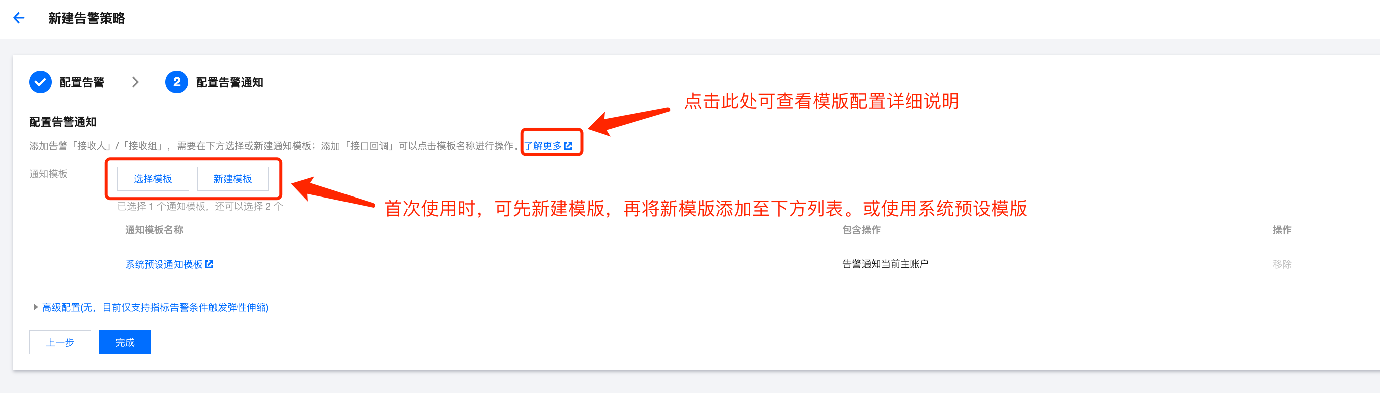 通知模板 | 选择已有模板或新建通知模板 |