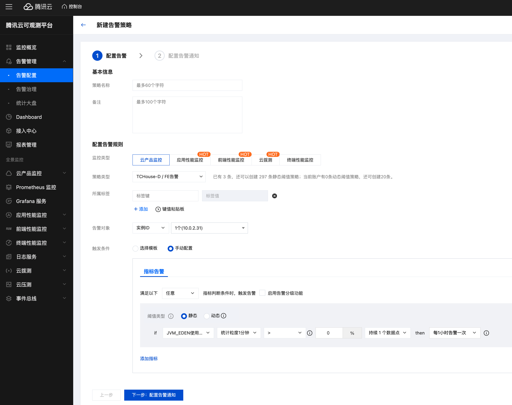 2. 在新打开的新建告警策略窗口中,根据下表所示填写告警基本信息,筛选需要配置的实例对象(集群名称),选择指标项并进行监控阈值配置。