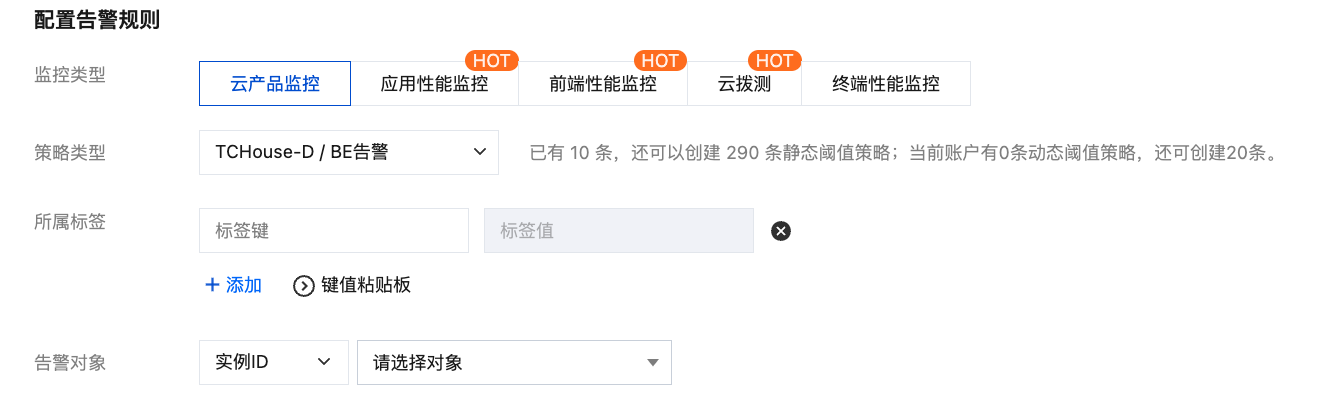 策略类型:选择“TCHouse-D/BE告警”或“TCHouse-D/FE告警”(注意:业务监控类指标的告警需要在“FE告警”类型下配置)。