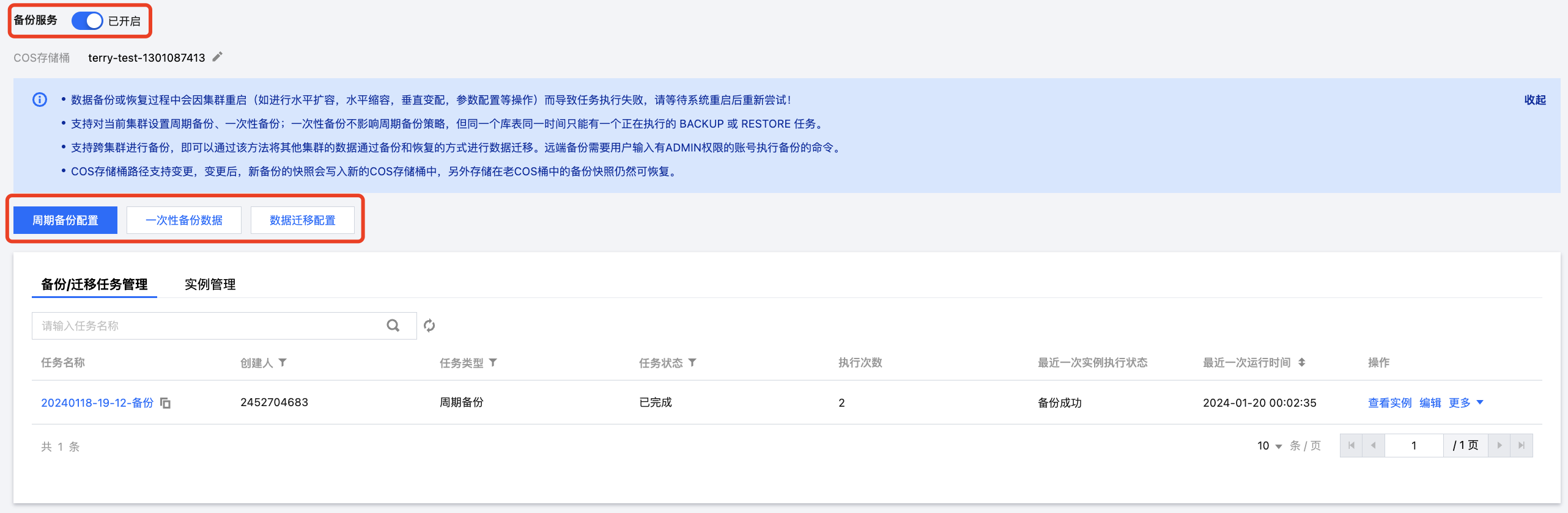 3. 开启备份服务后,可执行的操作包括:周期备份、一次性备份、跨集群数据迁移。备份功能支持任意选择要备份的库/表,备份成功后数据将永久保存。